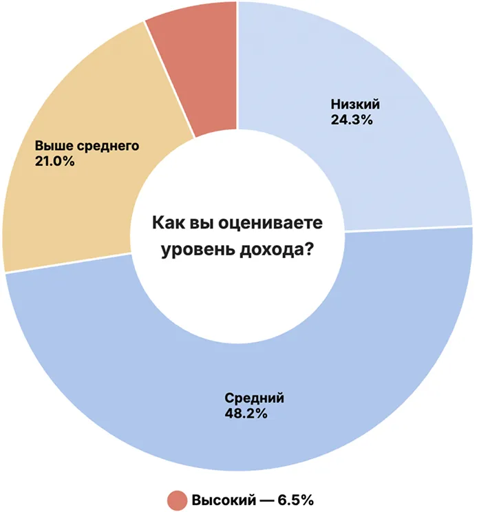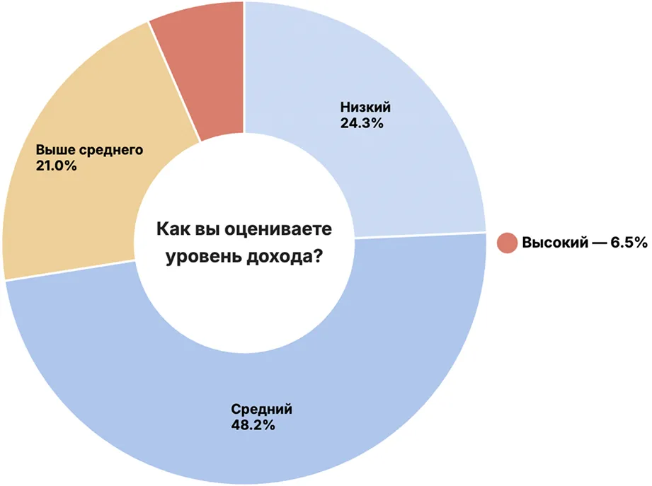 調査参加者のほぼ半数、48.2%は自分の収入を中程度と評価しています。「平均以上」を選んだのは21%、「低い」は24.3%です。