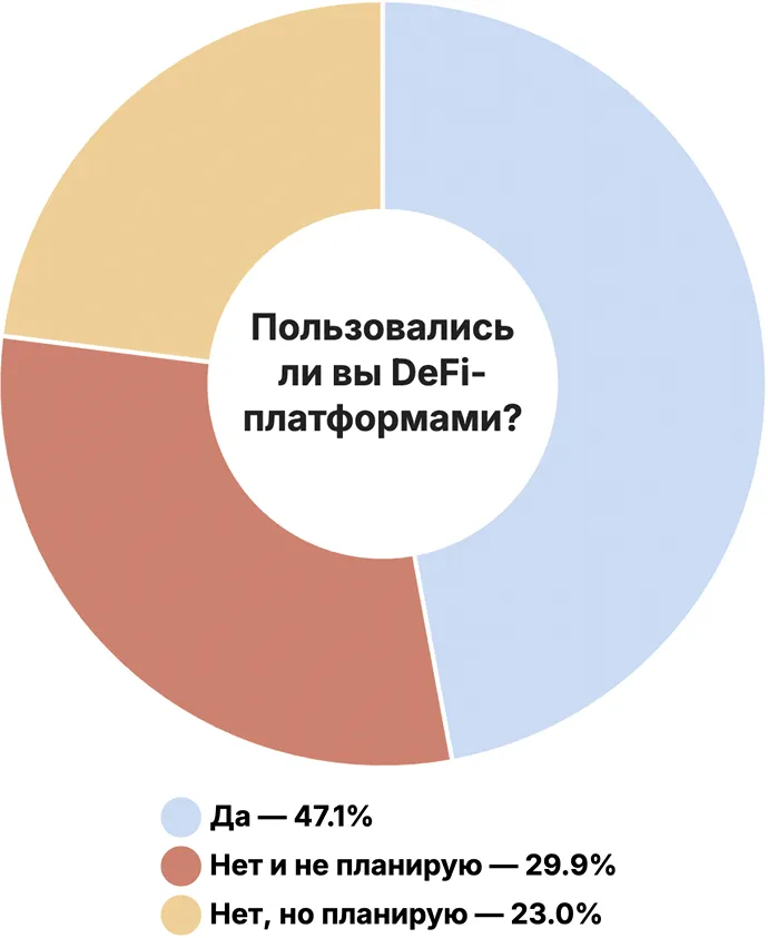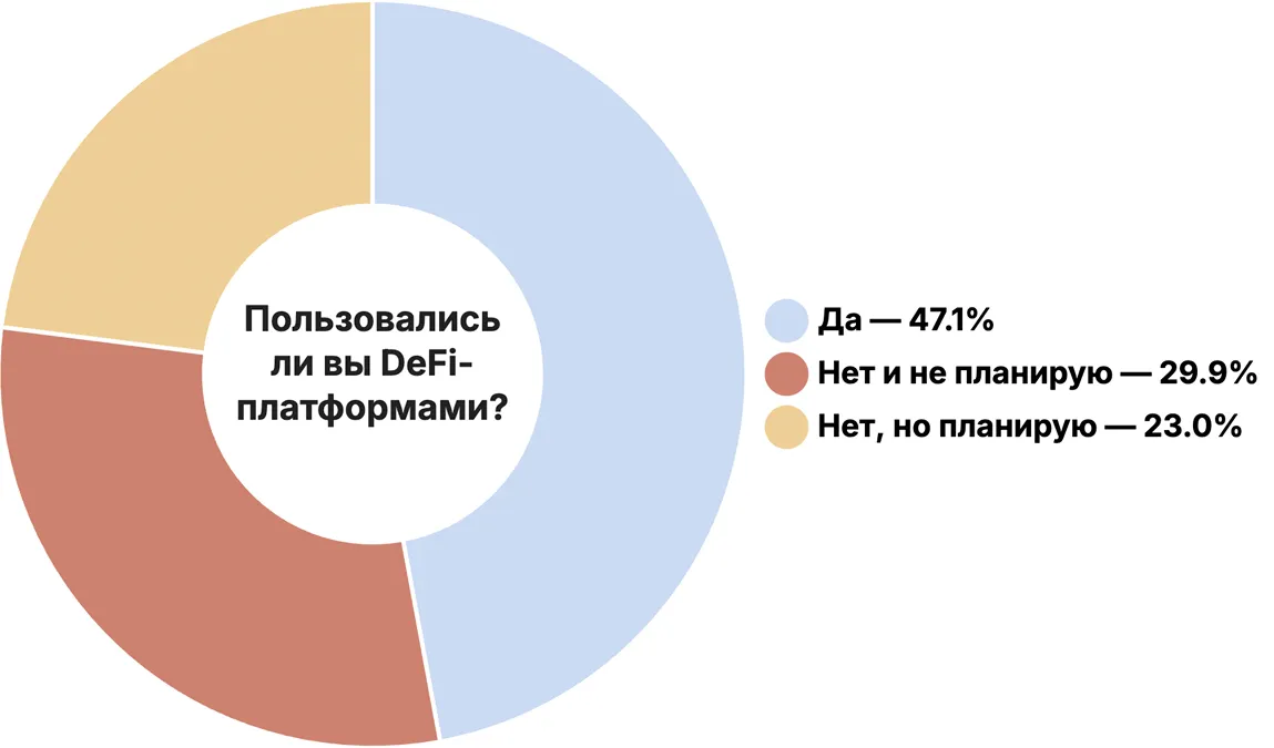 2025年には、47.1%の回答者がDeFiプラットフォームを利用しています。さらに23%は将来的に利用予定です。