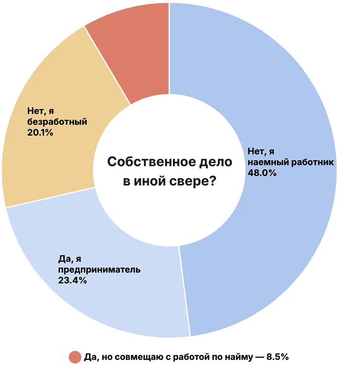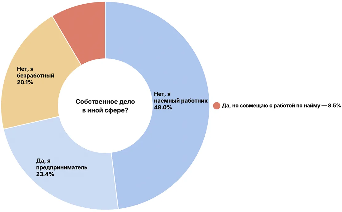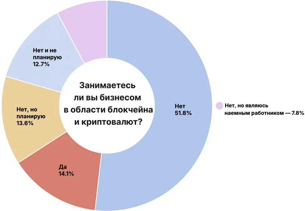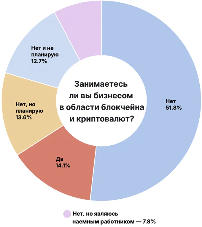 ブロックチェーンと暗号通貨に関わるビジネスに従事しているのは14.1%、関わる予定のあるのは13.6%です。調査対象の半数近く、48%は雇用者で、23.4%は起業家と自己申告しています。「失業者」は20.1%です。