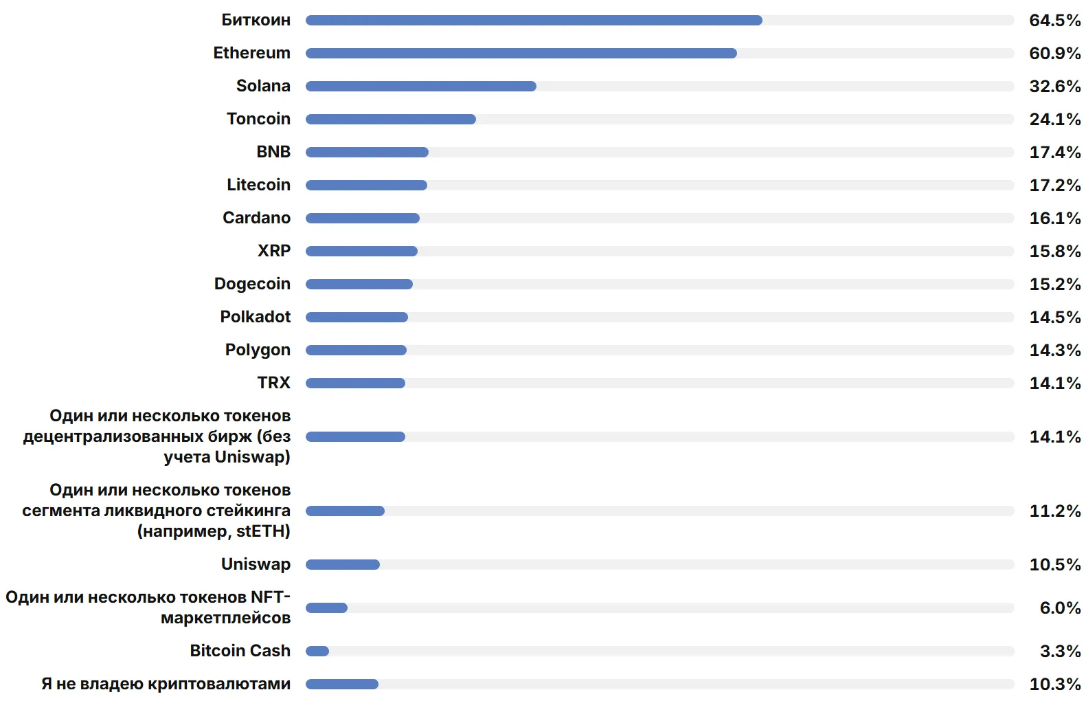 昨年の調査結果と比較して、ミームコインへの関心は低下しています。これらの資産を所有しているのは32.4%、持っていない、購入予定もないと答えたのは63.6%です。