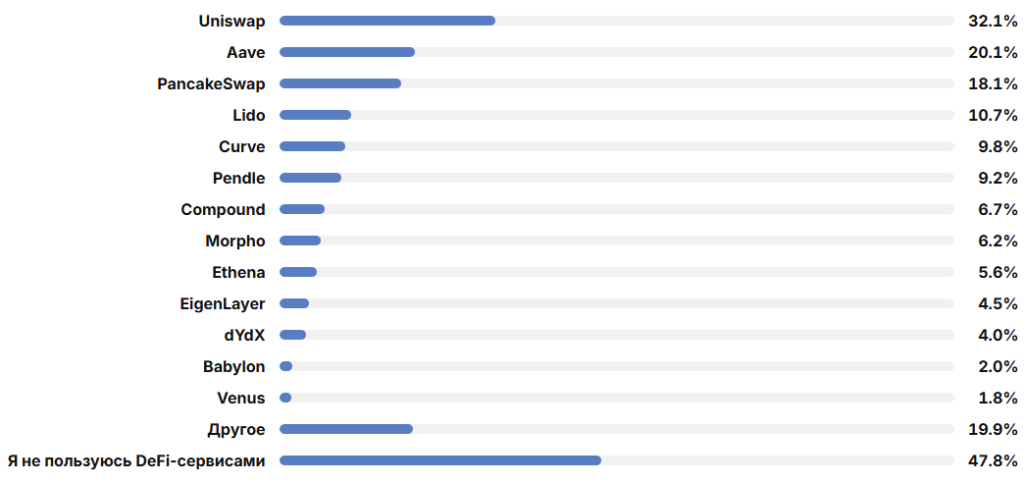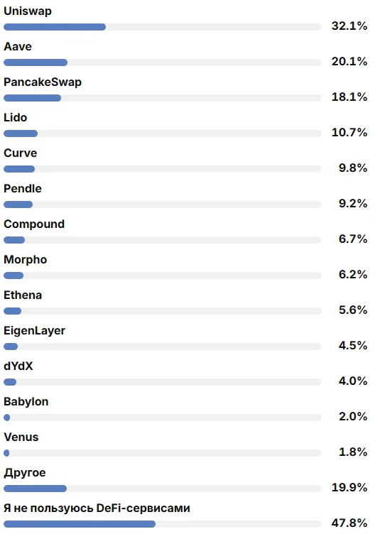 過去と同様に、読者の間で最も人気のあるサービスはUniswapで、32.1%が利用しています。次いでAaveが20.1%、PancakeSwapが18.1%です。