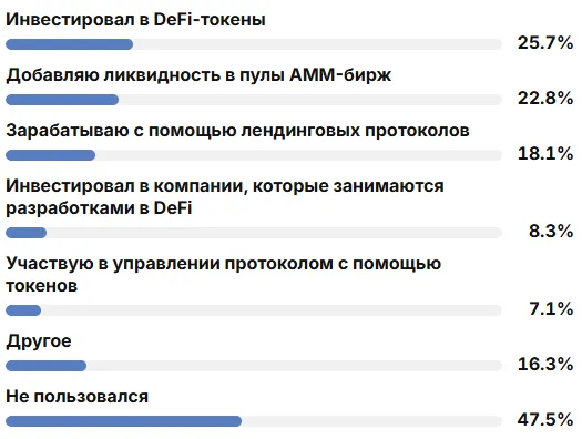 DeFiツールを使用していると答えた参加者のうち、25.7%はDeFiトークンを選びました。トークンを使ったプロトコル管理に参加しているのは7.1%、流動性をプールに提供しているのは22.8%です。