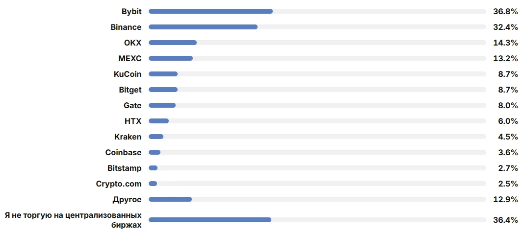中央集権型取引所の中で最も利用されているのはBybitで、36.8%です。次いでBinanceが32.4%、OKXが14.3%です。