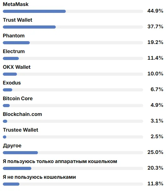 最も人気のあるウォレットはMetaMaskで44.9%、Trust Walletで37.7%です。