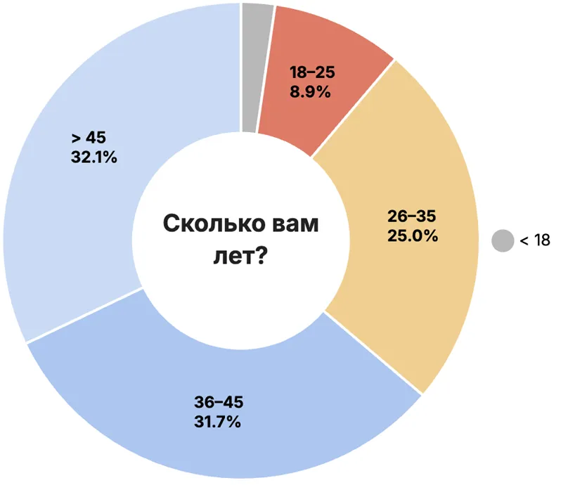 2025年11月3日から12月8日までの調査には448人が参加しました。回答者の大多数は45歳以上の男性で、ロシア在住です。調査参加者の女性は9.4%です。