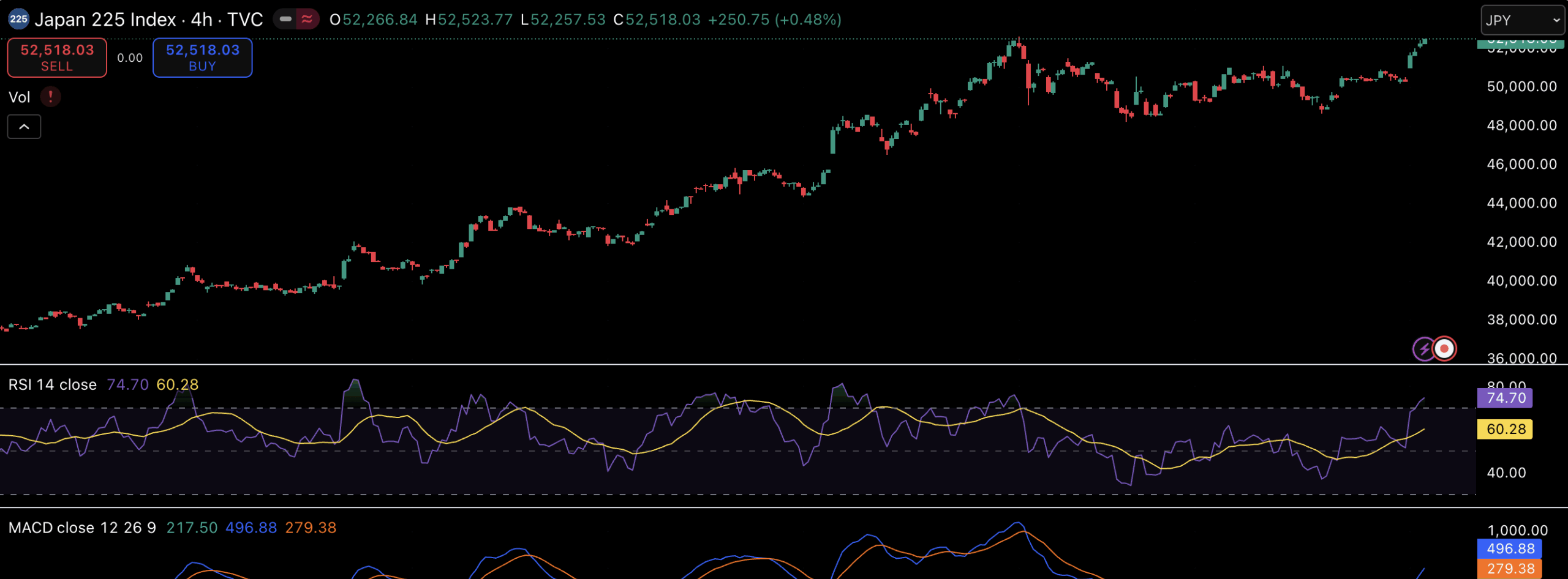 テクニカル的には、日経のブレイクアウトは強い勢いのシグナルとともに進行しています。現在、指数は52,500付近で取引されており、前回の高値ゾーンをしっかりと上回っています。