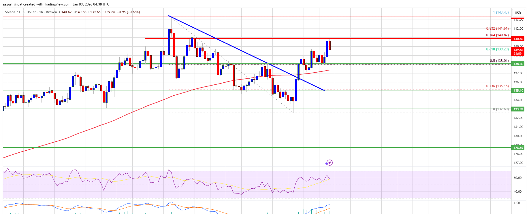 Solanaは現在、$138 および100時間単純移動平均線の上で統合しています。上昇局面では、価格は$140 付近と下落の$143 スイングハイから$132 ローまでの76.4%フィボナッチリトレースメントレベルの近くで抵抗に直面しています。次の主要な抵抗は$142 レベル付近です。