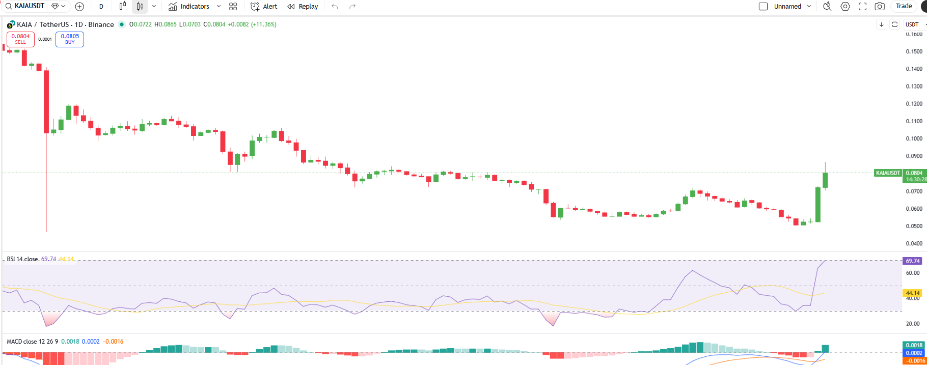 RSIやMACDなどのテクニカル指標は、Kaiaの強気の見通しを示しています。RSIは69.74で、強い買い勢いを示し、買われ過ぎの領域に近づいています。一方、MACDラインはシグナルラインの上にあり、緑色のヒストグラムが示すように、強気のトレンドを強化しています。