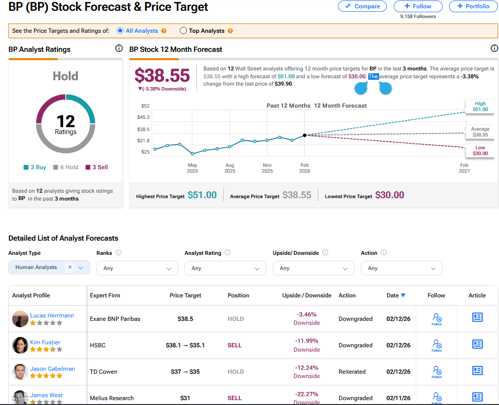 TipRanksでは、BPは3つの買い推奨、6つの保留、3つの売り推奨に基づき、ホールドのコンセンサスを得ています。最高の目標株価は51ドルです。BP株のコンセンサス価格目標は38.55ドルで、3.43%の下落余地を示しています。