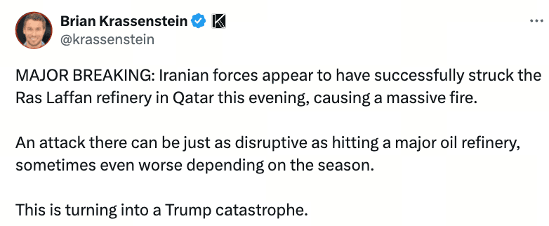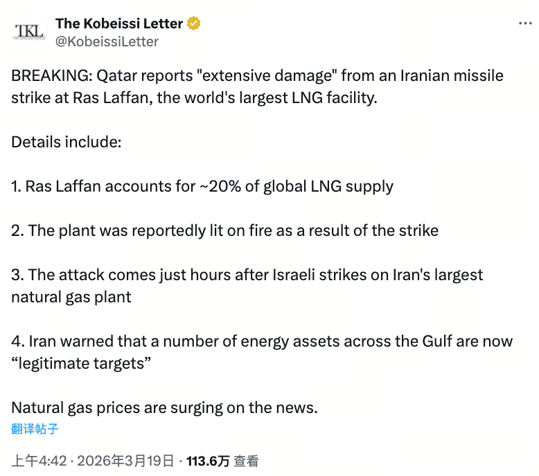 2026年3月18日から19日にかけて、世界最大の液化天然ガス(LNG)輸出拠点であるカタールのラスラファン工業都市がミサイル攻撃を受け、主要な生産施設が深刻な被害を受けました。これは中東紛争において、世界的なエネルギー輸出インフラを直接標的とした初の事例であり、地域の緊張が海上輸送封鎖から生産側への直接攻撃へとエスカレートしたことを示しています。カタールエネルギー公社は公式に、今回の攻撃により2つのLNG生産ライン(トレイン4とトレイン6)が停止し、同国の総輸出能力の約17%、年間生産能力1,280万トンに影響を及ぼしたことを確認しました。同公社は一部のアジア・ヨーロッパの買い手に通知し、長期供給契約において最大3~5年の「不可抗力」条項が発動される可能性があるとしています。## 72時間の紛争激化この攻撃は孤立した事件ではなく、最近の中東の軍事衝突の激化の一環です。現状を理解するには、72時間以内の一連の連鎖反応を整理する必要があります。| 時間(2026年3月) | 重要な出来事 | 性質と影響 || --- | --- | --- || 18日 | イスラエル国防軍がイラン南部のブシェル州南パルス油田関連施設を攻撃 | 初めて世界最大の天然ガス田の一部であるイランの一部に触れ、イランのエネルギーの生命線に対する直接的な打撃と見なされる。 || 18日~19日 | イラン革命防衛隊がカタールラスラファン工業都市にミサイル攻撃を行い、多くの施設が被弾し火災を引き起こす | 反撃行動は世界最大のLNG輸出拠点を標的とし、戦火を海上航路から陸上の生産拠点へと拡大させる。 || 19日 | カタールエネルギー公社のサアド・カビ最高経営責任者(CEO)が被害状況を明らかに:2つのLNG生産ラインが破壊され、GTL(ガス・トゥー・リキッド)施設も被害、修復には3~5年を要する見込み | 公式に長期的な生産停止を確認。市場予想の「数週間または数ヶ月」よりも大きな影響となる。カタールは北方ガス田の拡張計画も一時停止を発表。 || 19日~20日 | 世界の天然ガスおよびコモディティ市場が激しく反応。ヨーロッパの天然ガス基準価格は一時35%急騰。ブレント原油価格は106ドル超で推移 [Gate市況データ] | 長期供給不足のリスクが市場に織り込まれ、エネルギー分野からより広範な工業・消費分野へのパニック的な動きが拡大。 |## 構造的地位と被害規模ラスラファンへの攻撃がシステムリスクを引き起こす理由は、その世界のエネルギー供給チェーンにおける構造的な地位にあります。今回の被害規模のデータは、事態の実態を明らかにしています。**主要被害データ:**- LNG生産能力の喪失:1,280万トン/年、カタール総輸出能力の約17%- 収益への影響:カタールエネルギー公社は年間約200億ドルの損失を見込む- 修復期間:生産ラインの修復に3~5年、GTL施設の修復には少なくとも1年- 関連産業の損失:凝析油輸出は24%減少、LPG輸出は13%減少、ヘリウム生産は14%減少**構造的地位:**ラスラファン工業都市は、カタールのLNG輸出のほぼ全てを担っており、カタールの世界のLNG取引におけるシェアは約20%です。つまり、今回の攻撃により、今後数年間で世界のLNG供給の約3%~4%(20%×17%)が市場から退出することになります。さらに重要なのは、カタールの輸出流向が高度に集中している点です。アジア市場は輸出量の85%を吸収しています。国別の依存度は大きく異なります。- 高依存国:パキスタン(99%のLNG輸入がカタールとUAEから)、バングラデシュ(72%)、インド(53%)- 中程度依存国:韓国、シンガポール、台湾- 低依存国:中国本土(LNG供給の6%がカタール由来)、日本(5%)これにより、世界的な価格上昇は共通しているものの、南アジアや北東アジアの一部経済圏は、物理的な供給不足リスクが中日などに比べて格段に高いことが浮き彫りとなっています。## 主流の見解と議論この事件を巡り、市場や専門機関の間でいくつかの主要な論点が浮上しています。- 「不可抗力」の長期化:市場では、カタールが宣言した「不可抗力」は短期的な履行免除にとどまらず、長期にわたる供給契約の再構築を意味すると見られています。これにより、長期契約に依存するイタリア、ベルギー、韓国などの企業は実質的な打撃を受ける可能性があります。- 欧州の「脱工業化」リスクの再燃:分析によると、欧州はパイプラインガスを失った後、既に世界のLNG市場に依存している状況です。供給側の長期的な損傷により、ガス価格が高止まりすれば、化学、鉄鋼、肥料などエネルギー集約型産業はコストが制御できなくなる可能性があり、新たな産業の移転や減産を引き起こす恐れがあります。- 「需要破壊」が避けられない:複数のコンサルティング機関は、現行の価格水準は一部の新興国の耐性を超えていると指摘。パキスタンやバングラデシュはLNGのスポット調達を大幅に削減し、石炭への依存を高める可能性があります。Wood Mackenzieは、供給断続が続けば、北東アジアのLNG需要は第3四半期に400万~500万トン減少する見込みです。## 伝播経路:エネルギーから暗号市場へ今回の攻撃の影