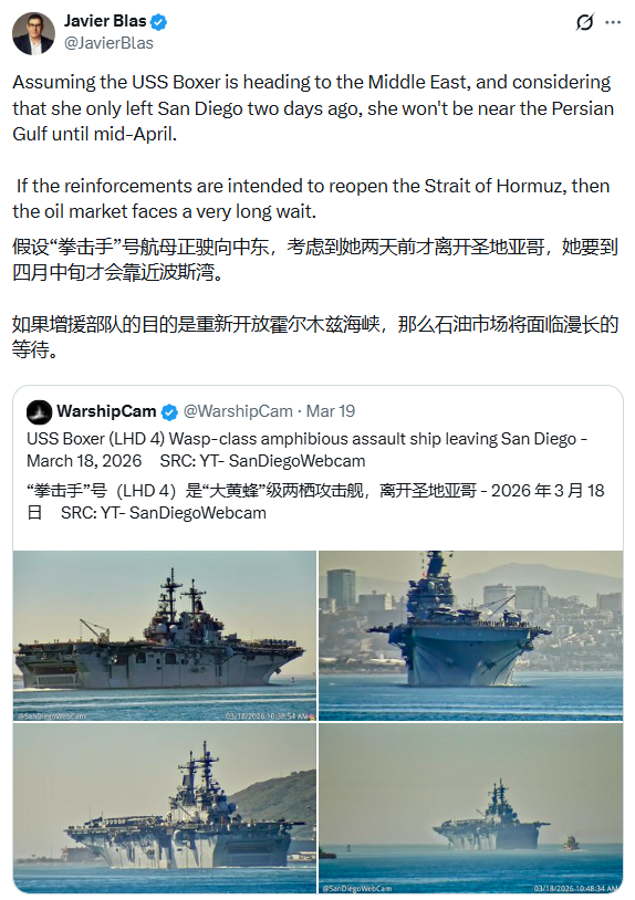エネルギー業界のコラムニスト、ハビエル・ブラスは、ソーシャルメディア上で、「拳師」号はサンディエゴを離れてからわずか2日前であり、ペルシャ湾付近に到達するのは最早4月中旬になると指摘している。彼はこう書いている。「もし今回の増援の目的がホルムズ海峡の再開であるならば、石油市場は長い待ち時間に直面するだろう。」