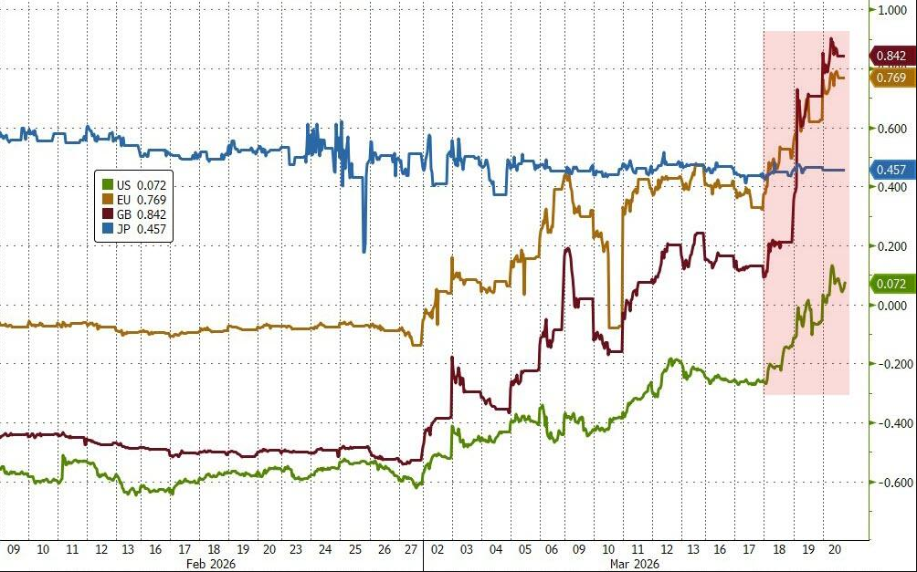 ブルームバーグのマクロストラテジスト、マイケル・ボールは以前、「エネルギーコストの上昇はインフレ効果をもたらし、消費者、企業の利益率、市場の信頼に同時に課税することに等しい」と指摘した。これが、今週各主要中央銀行がよりタカ派的なシグナルを発信した理由の一つだ。市場はすぐに欧州中央銀行や英国中央銀行の引き締め期待を織り込み、米連邦準備制度の今年の利下げ予想をすべて排除し、一時は利上げ観測さえ浮上した。