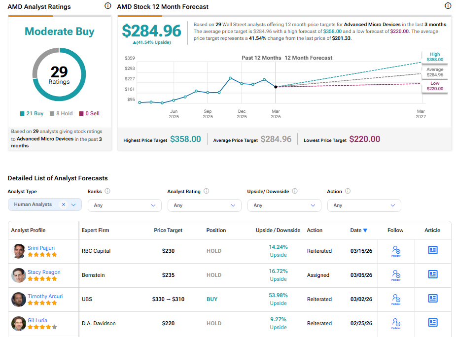 ウォール街のアナリストのコンセンサス評価は、「中程度の買い」となっており、過去3ヶ月で21件の買い推奨と8件のホールド推奨がある。これに基づき、AMDの平均株価目標は284.96ドルであり、株価には約41.54%の上昇余地が見込まれている。
