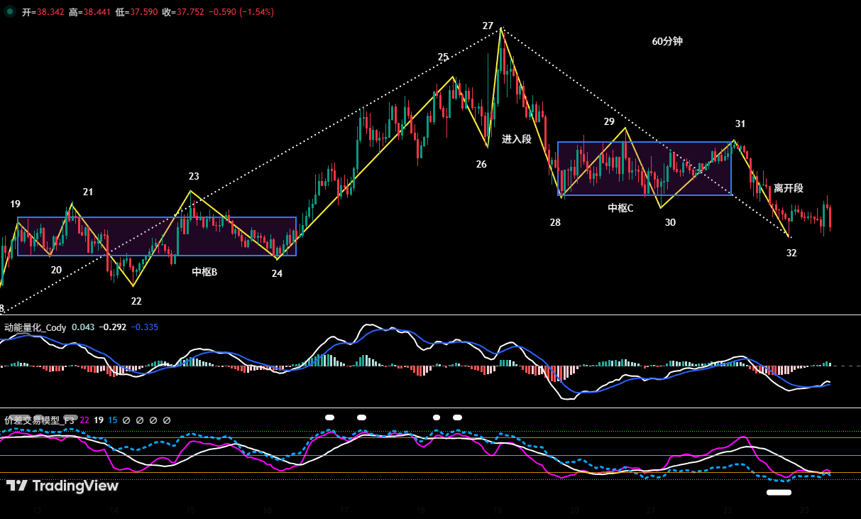 • エントリー:上昇中枢Bの完成後のトレンド継続を予測し、価格が中枢上限(約38.54ドル)を効果的に突破したタイミングで、価格差と動能量化モデルの買いシグナルが重なったため、30%の買いポジションを38.73ドルでエントリー。