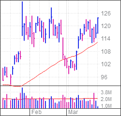 火曜日の午後、NXTの株価は5.3%上昇し、123.15ドルとなりました。これはダブルボトムのハンドルからの買いポイント123.24ドルをわずかに下回っています。