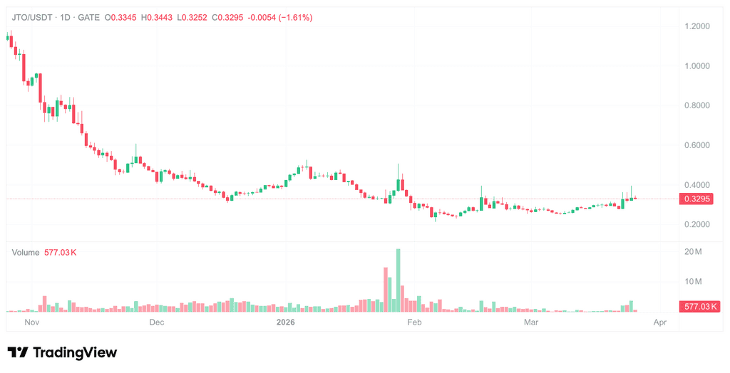 ソラナエコシステムにおいて、Jito(JTO)は、その革新的な最大可提取価値(MEV)ソリューションと流動性ステーキング製品により、重要なインフラプロジェクトと見なされてきました。しかし、最近の市場の激しい変動により、Jitoは再び注目を集めています。2026年3月26日現在、Gateの市場データによると、Jito(JTO)の価格は0.3317ドルであり、過去24時間で11.81%下落していますが、過去30日間では18.19%の上昇を記録しており、短期的には激しい変動を示しています。本稿は、事実、見解、推論を区別しながら、Jitoが直面する複雑な局面を客観的に分析することを目的としています。