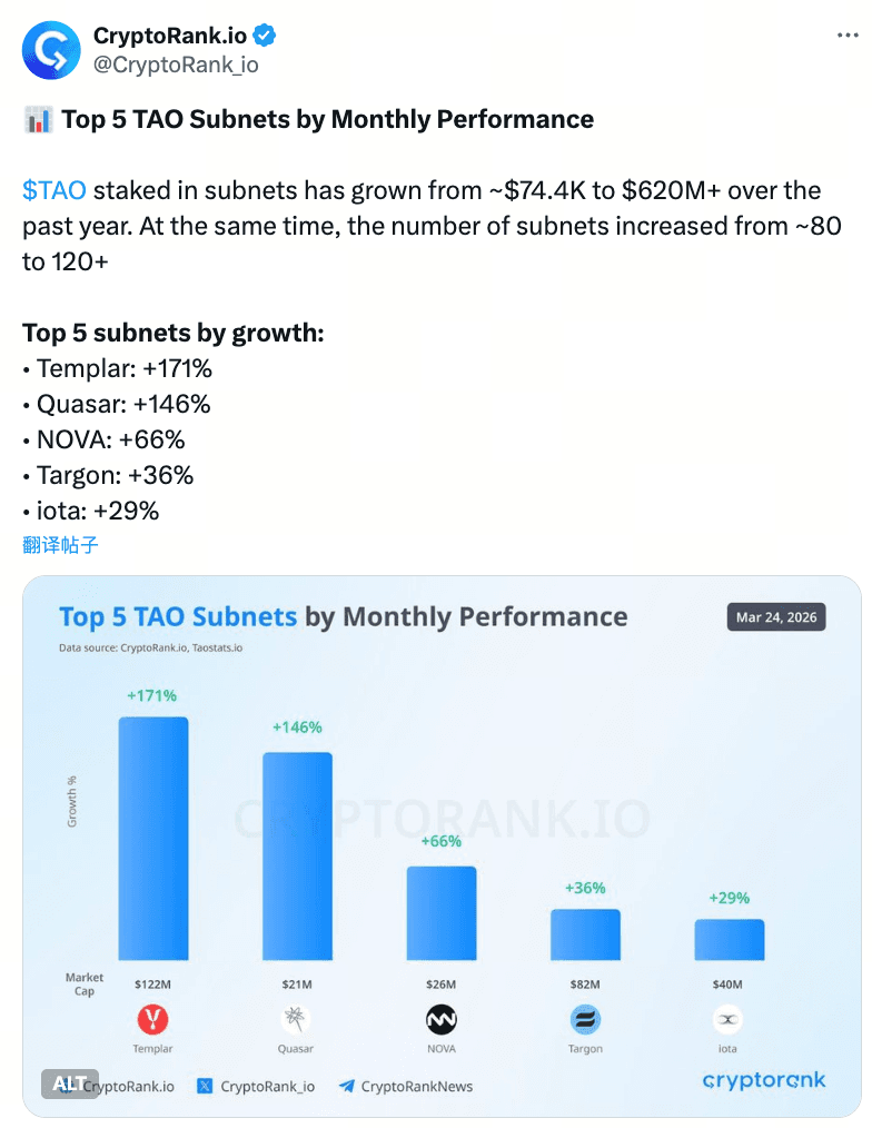 業界データ追跡機関の統計によると、2026年3月下旬時点で、Bittensorエコシステム内の各サブネットのTAOステーキング総量は、1年前の約74,400ドルから6.2億ドル超へと急増し、増加率は833,000%に達した。この成長は孤立した出来事ではなく、サブネット数の増加、サブネットトークンの時価総額の上昇、TAO価格の回復とともに進行している。特に注目すべきは、ステーキング総額が大きく増加している一方で、現状の流通供給量に対してはごく一部を占めており、今後の資金流入の余地を残している点だ。