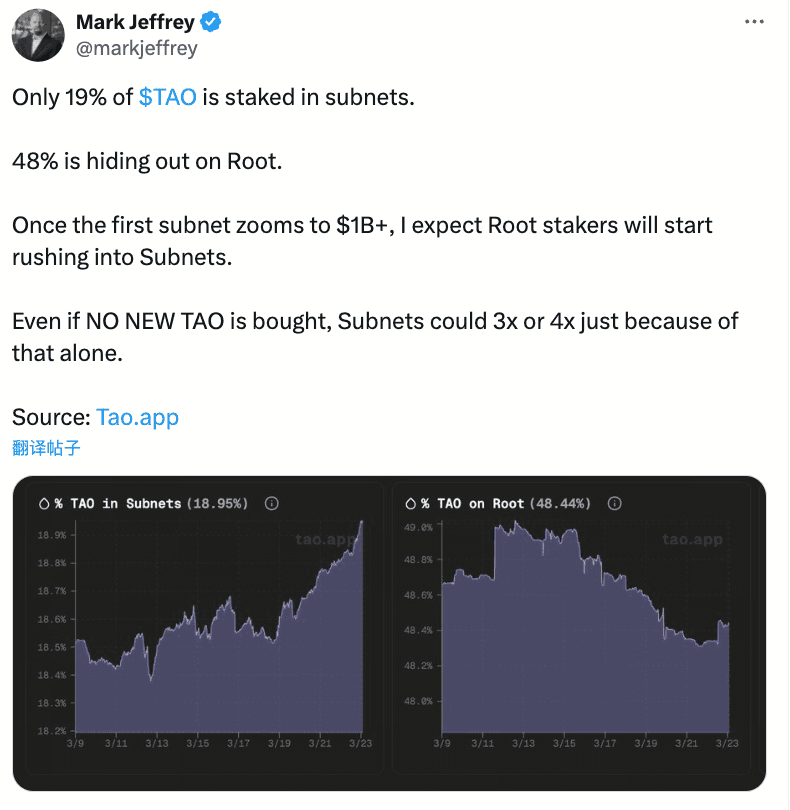 デセントラライズドAIインフラのナarrativeにおいて、BittensorとそのネイティブトークンTAOは常に中心的役割を果たしてきた。2026年第1四半期末、このエコシステムは重要なデータポイントを迎えた:サブネット内のTAOステーキング総量が1年で833,000%の成長を記録した。この数字は市場平均の成長率を大きく上回り、Bittensorエコシステムの構造的変化を観察する重要な窓となっている。本稿では、事象そのものを出発点に、タイムラインの整理、データ分析、世論の解剖、シナリオの推演を通じて、この成長の背後にある論理と潜在的な動向を描き出す。### 歴史的な飛躍:サブネットのステーキングが833,000%増加業界データ追跡機関の統計によると、2026年3月下旬時点で、Bittensorエコシステム内の各サブネットのTAOステーキング総量は、1年前の約74,400ドルから6.2億ドル超へと急増し、増加率は833,000%に達した。この成長は孤立した出来事ではなく、サブネット数の増加、サブネットトークンの時価総額の上昇、TAO価格の回復とともに進行している。特に注目すべきは、ステーキング総額が大きく増加している一方で、現状の流通供給量に対してはごく一部を占めており、今後の資金流入の余地を残している点だ。### 拡張の軌跡:80のサブネットから百億ドル規模のエコシステムへBittensorのサブネットエコシステムの拡大は、いくつかの明確なフェーズに分けられる。- **初期探索期(2024年 - 2025年初)**:サブネット数は約80のままで、ステーキング量は低調。参加者はエコシステムの早期構築者や深層研究者が中心。市場は「分散型AIネットワーク」のビジネスモデルの認知構築段階にある。- **成長期(2025年中 - 2026年初)**:AIのナarrativeが暗号市場で持続的に盛り上がる中、Bittensorのサブネットはより多くの開発者と資本の関心を集め始める。サブネット数は約80から120超へと増加。これに伴い、複数のサブネットが独自のトークンを発行し、「サブネット経済圏」が形成される。- **爆発期(2026年第1四半期)**:この四半期が重要な転換点となる。TAO価格は3月初めから顕著に反発し、複数のサブネットトークンの好調なパフォーマンスと相まって、短期間でステーキング総量が急増。TemplarやQuasarなどのサブネットは過去1ヶ月で170%超や140%超の上昇を記録し、この成長の牽引役となった。| 成長段階 | 時期 | サブネット数 | ステーキング量の変化(概算) | 主要特徴 || --- | --- | --- | --- | --- || 初期探索期 | 2024年 - 2025年初 | 約80 | 10万ドル未満 | エコシステム立ち上げ、早期構築者中心 || 成長期 | 2025年中 - 2026年初 | 80 → 120+ | 数千万ドルへ拡大 | サブネット数増加、トークン発行 || 爆発期 | 2026年第1四半期 | 120超 | 6.2億ドル超に急増 | サブネットトークンの好調とTAO価格の回復 |### 資金分布と構造的分化この成長の構成要素をより明確に理解するために、資金分布と市場のパフォーマンスの二つの視点から解剖する。- **ステーキング分布**:サブネットのステーキング総量は急増しているが、データによると、約48%のTAOがルートネットワークにステークされており、サブネット内の比率はわずか19%に過ぎない。これは、多くのTAO保有者がリスクの低いルートネットワークにトークンを預け、安定したリターンを追求していることを示す。- **サブネットトークンの時価総額**:すべてのBittensorサブネットトークンの合計時価総額は15億ドルを超え、追跡されたサブネットの多くは過去1ヶ月でプラスリターンを実現している。特にTemplar、Quasar、NOVA、Targon、iotaなどが目立つ。- **TAOの市場データ**:Gateの価格データによると、2026年3月26日時点でTAOは340.4ドル。過去30日で99.76%の上昇、7日間で28.99%の上昇を記録。24時間取引高は1,533万ドル、市場のセンチメントは中立。流通供給量は959万TAO、市場時価総額は32.5億ドル。- **資金流動の潜在規則**:一部の市場分析では、「ルートネットワークを中心に、サブネットが矛のように分散している」構造が示唆されている。もしも、あるヘッドサブネットの経済価値が10億ドルを突破すれば、ルートネットワークのステーキング者の大規模な資金移動が引き起こされる可能性がある。資金は安定したリターンを追求する層から、より高い成長ポテンシャルを持つサブネットへと流れる。新たな資金流入がなくとも、既存資金の再配置だけで、サブネットのステーキング総量は現状の3〜4倍に増加し得る。- **エコシステムの「中央集権化」と「分散化」の緊張**:サブネットの経済価値が高まるにつれ、ヘッドサブネットの影響力はさらに拡大する可能性がある。これにより、エコシステム内でのガバナンス権重、資源配分、さらには「サブネットが過度に中央集権化しているのではないか」といった議論が生じる可能性もある。ネットワークの全体的な分散性とサブネットの発展の活力をいかにバランスさせるかは、今後のBittensorエコシステムの長期的課題となる。### 市場の見解の二極化解剖Bittensorサブネットエコシステムの急速な拡大に対して、