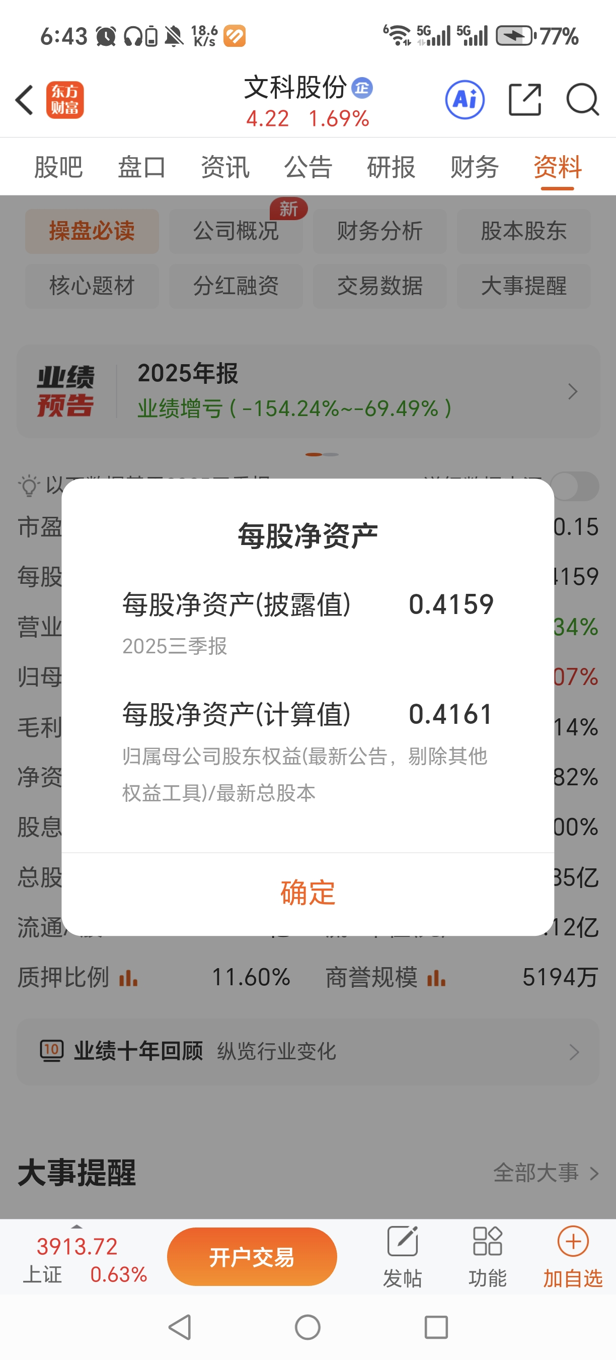 私は同花順と東方财富が発表した第3四半期の統計は0.42で、集思録の統計は0.58、私自身も0.58と計算しました。042で計算すると、会社の第3四半期の純資産は2.65億で、予想損失は2-3億、純資産がマイナスになる可能性がありますが、会社は上場廃止リスクを警告していません。財務報告書には親会社株主に帰属する权益が3.7億と書かれています(これは純資産だと思いますが、同花順と東方财富の計算結果はどちらも042なので、私の計算が間違っているのではないかと心配しています。もし本当に*stになったら終わりです)。それで皆さんにお尋ねしたいのですが、私が計算を間違えたのでしょうか、それとも同花順が間違ったのでしょうか?年次報告の後にstになりますか?