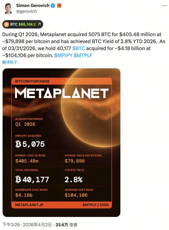 Metaplanetの最高経営責任者(CEO)Simon Gerovichは4月2日に、同社が2026年の第1四半期に総対価約4.055億ドルで5,075枚のビットコインを購入したことを確認した。ビットコイン・リザーブ追跡機関BitcoinTreasuriesのデータによると、この買い増しによりMetaplanetの総保有量は40,177枚となり、世界の上場企業におけるビットコイン保有量ランキングでは3位に位置する。