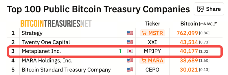 Metaplanetは5,075ビットコインを追加保有し、世界の上場企業の中で第3位の最大保有者に躍り出ました。