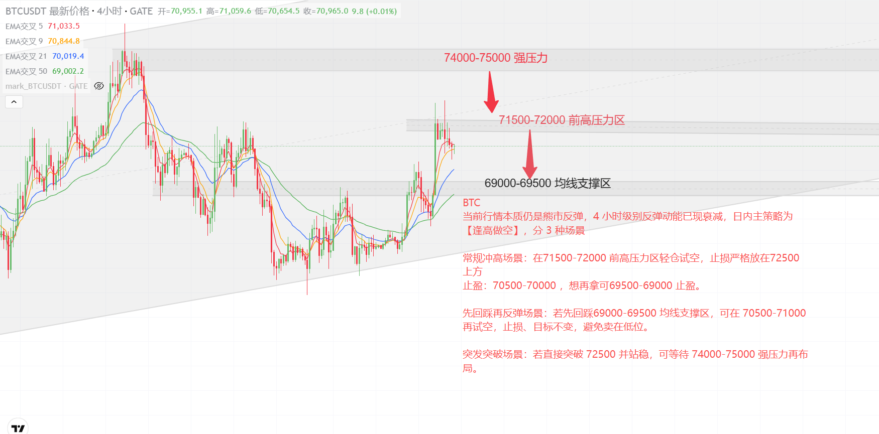 BTC現在の相場の本質は依然として弱気相場のリバウンドであり、4時間足のリバウンド動力はすでに減衰しています。日中の主戦略は【高値を追って売り(逢高做空)】で、3つのシナリオに分けます。通常の急騰(高値更新)シナリオ:71500-72000の前の高値圧力帯で少量を試し売りし、損切りは72500の上方に厳格に設定します。利確:70500-70000。さらに持つなら69500-69000で利確します。いったん押してからリバウンドするシナリオ:まず69000-69500の移動平均線のサポート帯まで押す場合は、70500-71000でもう一度試し売りできます。損切りと目標は変えず、安値で売ってしまうことを回避します。突発的なブレイクシナリオ:もし直接72500を突破して定着するなら、74000-75000の強い圧力まで待ってから布陣します。