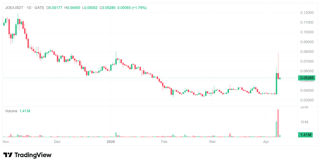 過去1週間を振り返ると、JOEは「先に上昇してから下落する」顕著な相場展開を経験しました。4月7日から8日にかけて、JOE価格は最安値の約0.0352ドルから最高値の約0.0779ドルへ急激に上昇し、振れ幅は最大で120.7%に達しました。取引量も同時に急増し、約8,063万〜8,466万ドルへ拡大、上昇率は3,500%以上で、平常時を大幅に上回りました。Gateのマーケットデータでも、4月8日のJOEは0.0747ドルで、24時間で59.55%上昇し、最高値が0.064ドル、最安値が0.0352ドルと示されています。しかし、その後の取引では価格が明確に下落し、4月9日には0.0528ドル付近まで下がっています。これは、高ボラティリティの後に利益確定圧力がかかったことを反映しています。