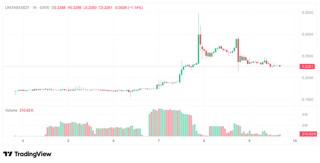 暗号資産業界のインフラが徐々に整ってきた現在、国境を越えた決済と価値の裏付け(バリュー・アンカリング)は、従来の金融とオンチェーン経済を結びつける中核的な戦場であり続けています。最近、「Unitas」と呼ばれるプロトコルと、そのトークンである UNITAS がセカンダリー市場で大きな値動きと幅広い注目を集めています。2026年4月9日現在、Gate の相場データによれば、UNITAS の価格は直近30日間で 196.56% という驚異的な上昇を記録しました。短期的な押し目があったものの、市場規模(時価総額)は 2.29億米ドル付近まで拡大しています。