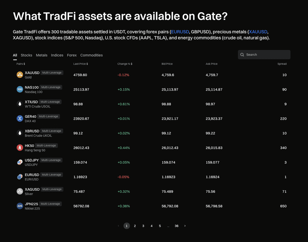 Gate TradFiは世界中の多様な市場をカバーし、投資家が以下を含むがこれに限定されない直接参加を支援する。