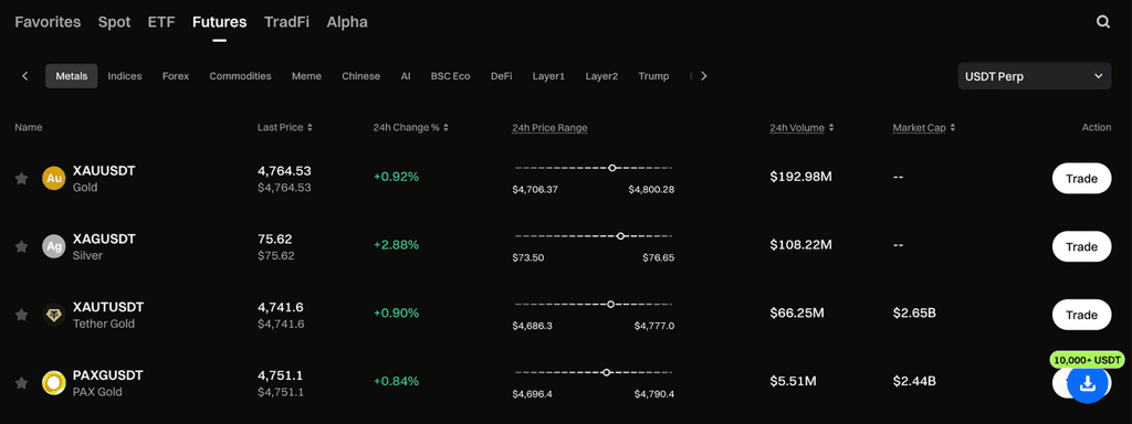 暗号取引プラットフォームの発展に伴い、投資家の貴金属市場への参加方法は従来の金融市場からデジタル取引プラットフォームへと拡大している。Gateの金属エリアでは、金と銀のUSDT無期限契約取引を提供し、利用者はプラットフォーム上で金銀の価格変動を直接追跡・取引できる。