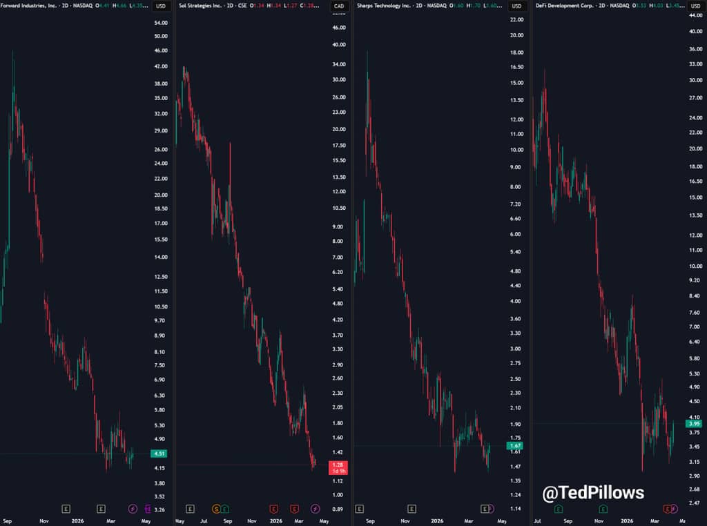 上場企業が国庫資産を単一の暗号資産に高度集中させると、その株価はもはや主な事業活動だけによって動かされるのではなく、基底トークンの価格と深く連動した高ベータ構造となる。この特徴は、Solanaエコシステム関連の上場企業において特に顕著に表れている。2026年4月時点で、Solana(SOL)をコア財庫資産としている複数の上場企業の株価は、過去最高値から一般的に80%以上の下落を示し、一部銘柄は90%近くまたはそれを超える下落を記録し、典型的な高ボラティリティ資産の「再価格設定」過程を示している。市場はこの種の株式の動きを、流動性枯渇段階のオンチェーン資産と類比し、そのリスク解放サイクルにあるかどうかについて議論を始めている。## Solana保有上場企業の深度下落資産負債表にSolanaを顕著に配置している複数の上場企業は、過去数ヶ月間に激しい評価圧縮を経験している。Forward Industries(FWDI)などのSolana財庫企業は、2025年中後期の暗号市場全体の調整と米国株のリスク志向低下の背景の中、株価は過去高値から累計で90%以上下落し、この分野で最も顕著な下落を示す銘柄の一つとなった。同時期、Sol Strategies(STKE)は、Solana財庫戦略の強化を続ける中で、株価の下落幅は約90%~92%に拡大した。Sharps Technology(STSS)は、Solana関連資産の配置と資金調達拡大を進めた後、市場価値は高値から約85%~90%の下落を記録した。DeFi Development Corp(DFDV)は、SOLの継続的な増持を背景に、約75%の段階的下落を示した。一部の市場分析者(Ted Pillowsを含む独立研究者)は、これらの資産価格動向は、流動性縮小段階における高ボラティリティのオンチェーン資産の下落形態と構造的に類似しており、市場の感情が著しく修復される前には、さらに約30%~50%の追加下落リスクが存在すると指摘している。*出典:@TedPillows*## 高値からの配置と評価再設定これらの企業の株価調整は孤立した事象ではなく、Solana自体の価格サイクルと密接に関連している。2025年中後期に遡ると、Solana(SOL)は一時200ドル以上の範囲で推移し、「上場企業が暗号資産を準備資産として保有する」戦略に対して拡大志向の期待が一般的に高まり、関連銘柄も評価拡大段階に入った。しかし、市場が調整局面に入ると、Solanaの価格は徐々に下落した。2026年4月13日時点で、SOLの最新成交価格は約82.02ドルであり、日内変動範囲は81.30ドルから82.89ドルの間だった。長期的に見ると、過去12ヶ月で約30%~40%の下落を示し、時価総額は約471.7億ドル、流通供給量は約5.7452億枚となっている。基底資産の価格の継続的な下落は、保有企業の資産側の価値を直接侵食し、二次市場における関連株の体系的な再評価を促進している。## 保有構造と未実現損失圧力公開情報と市場調査機関の推定データに基づき、主要なSolana財庫型上場企業の保有状況と浮動損益はおおむね以下の通りである。| **企業** | **SOL保有規模** | **平均コスト(推定)** | **未実現損益** | **株価下落率** || --- | --- | --- | --- | --- || Forward Industries (FWDI) | 約690万 SOL | 約$230 | 約-10億ドル規模 | >90% || Sol Strategies (STKE) | 約52万 SOL | 非公開 | 非公開 | 約90%~92% || Sharps Technology (STSS) | 約200万 SOL | 約($390Mコスト規模) | 約-2億ドル規模 | 約85%~90% || DeFi Development Corp (DFDV) | 約220万 SOL | 非公開 | 約-5600万ドル規模 | 約75% |構造的に見ると、これらの企業の核心的リスクは、経営キャッシュフローの悪化ではなく、資産側の大きな変動による評価ロジックの再構築にある。SOL価格が平均保有コスト範囲を著しく下回ると、市場はこれらの「暗号資産類似財庫企業」の評価方法を、成長プレミアムから流動性割引や潜在的な再資金調達リスクの割引へと段階的にシフトさせている。## ミームコイン類似の市場行動特性一部分析者は、こうした高集中度保有株は、下落過程においてオンチェーンの高ボラティリティ資産と類似した行動特性を示すと指摘している。具体的には、流動性縮小、買い注文の深さ不足、反発の持続性の弱さなどだ。安定した収益支えがない場合、これらの株の評価の錨は、基底の暗号資産価格に高度に依存する。SOLが重要コストラインを下回ると、市場参加者は「損失を最小限に抑えるために先行して退出する」行動ゲームに陥りやすく、下落の勢いを強化する。この類比は、市場行動の構造を描写するためのものであり、ファンダメンタルズの等価性を直接示すものではないことに注意が必要である。## 企業国庫集中配置のリスク伝播メカニズムこれらの企業は、限界的な暗号資産配置を行っているのではなく、資本運用や資金調達構造の中でSOLをコア資産として配置している。この高度集中化された資産構造は、株価とSOL価格の間にほぼ線形の連動関係を形成させている。例として、Forward Industriesは、特定段階でのSOL保有が同社の時価総額を大きく上回ることもあり、企業評価は暗号資産の変動をより反映し、主たる事業のキャッシュフローを反映しにくくなっている。SOLが継続的に圧力を受ける中、市場は潜在的なリスクシナリオを価