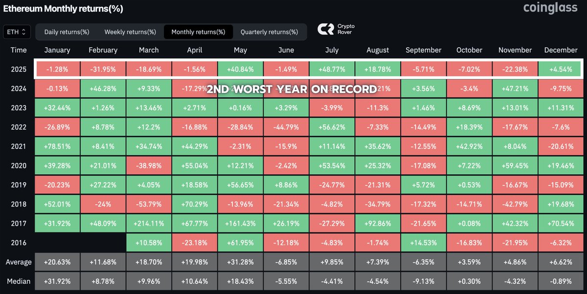 Crypto Roverのデータは、この技術的な躊躇に重要な背景を提供している。歴史的に見て、イーサリアムは現在、記録上2番目に悪い年間パフォーマンスをたどっている。これは、過去のサイクルと対照的であり、この段階ではしばしばETHの最も強力な上昇をもたらしてきた。