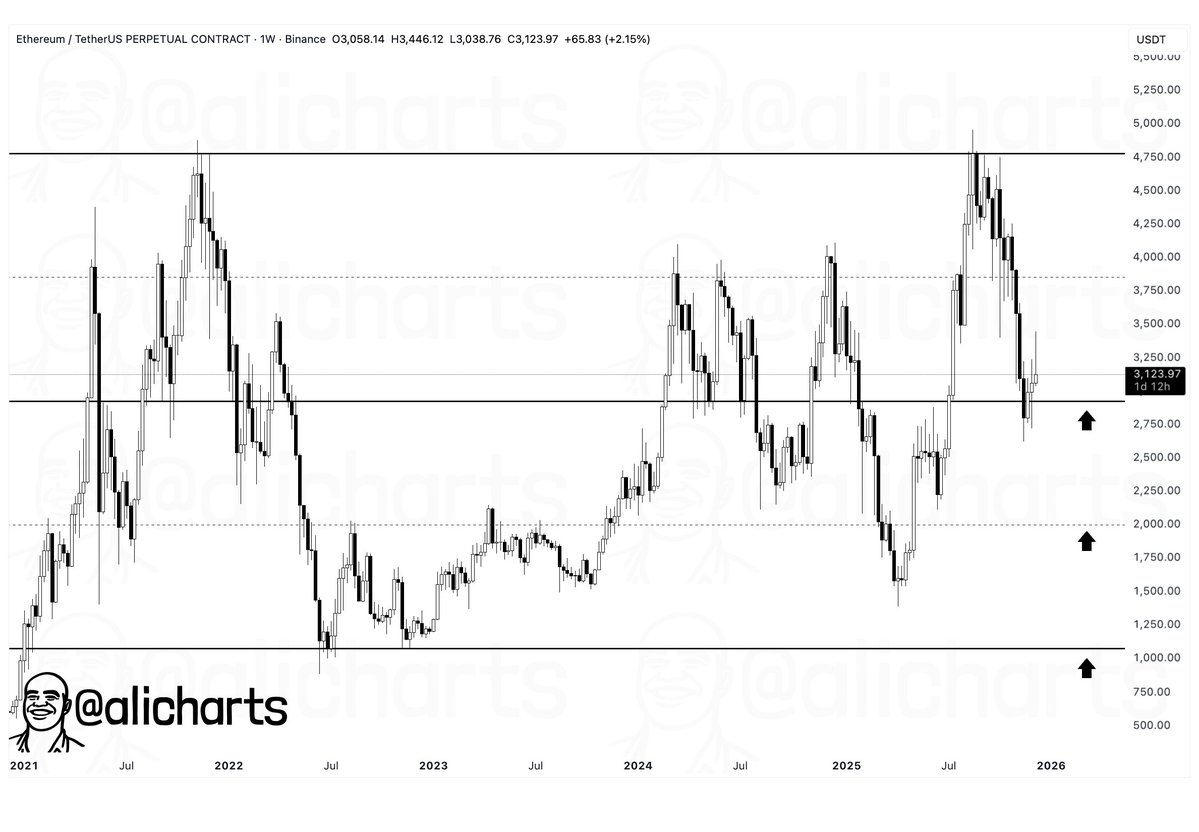 技術的観点から見ると、イーサリアムは長期にわたり抵抗線として機能してきたゾーンの下で抑えられ続けており、サイクルを通じて何度も価格を拒否してきた。週足チャートはおなじみのパターンを示している:急騰の後に同じくらい激しい調整が入り、ETHが上限付近に近づくと買い手が勢いを維持できずにいる。