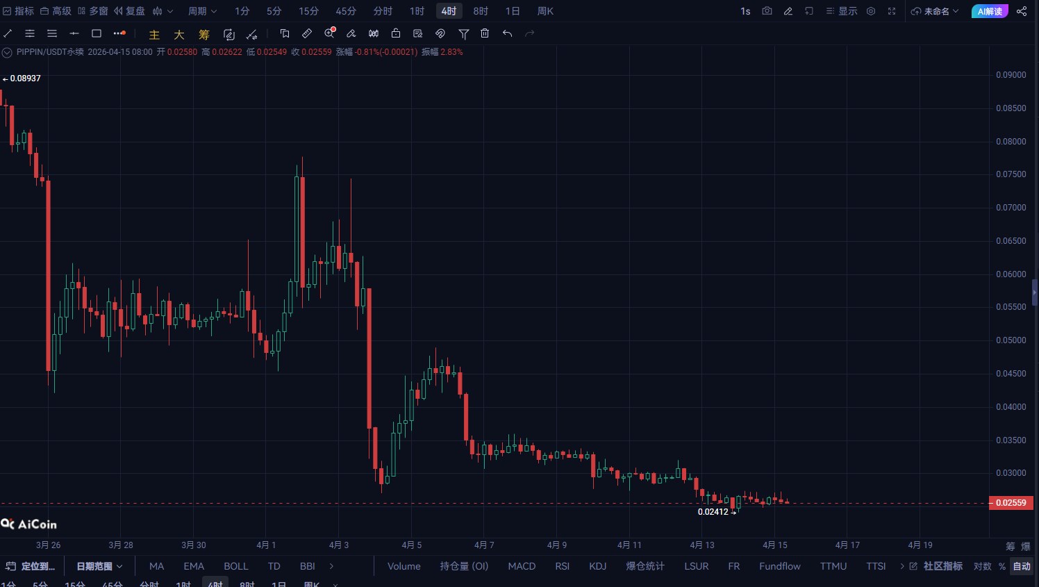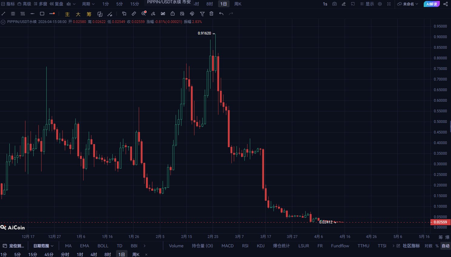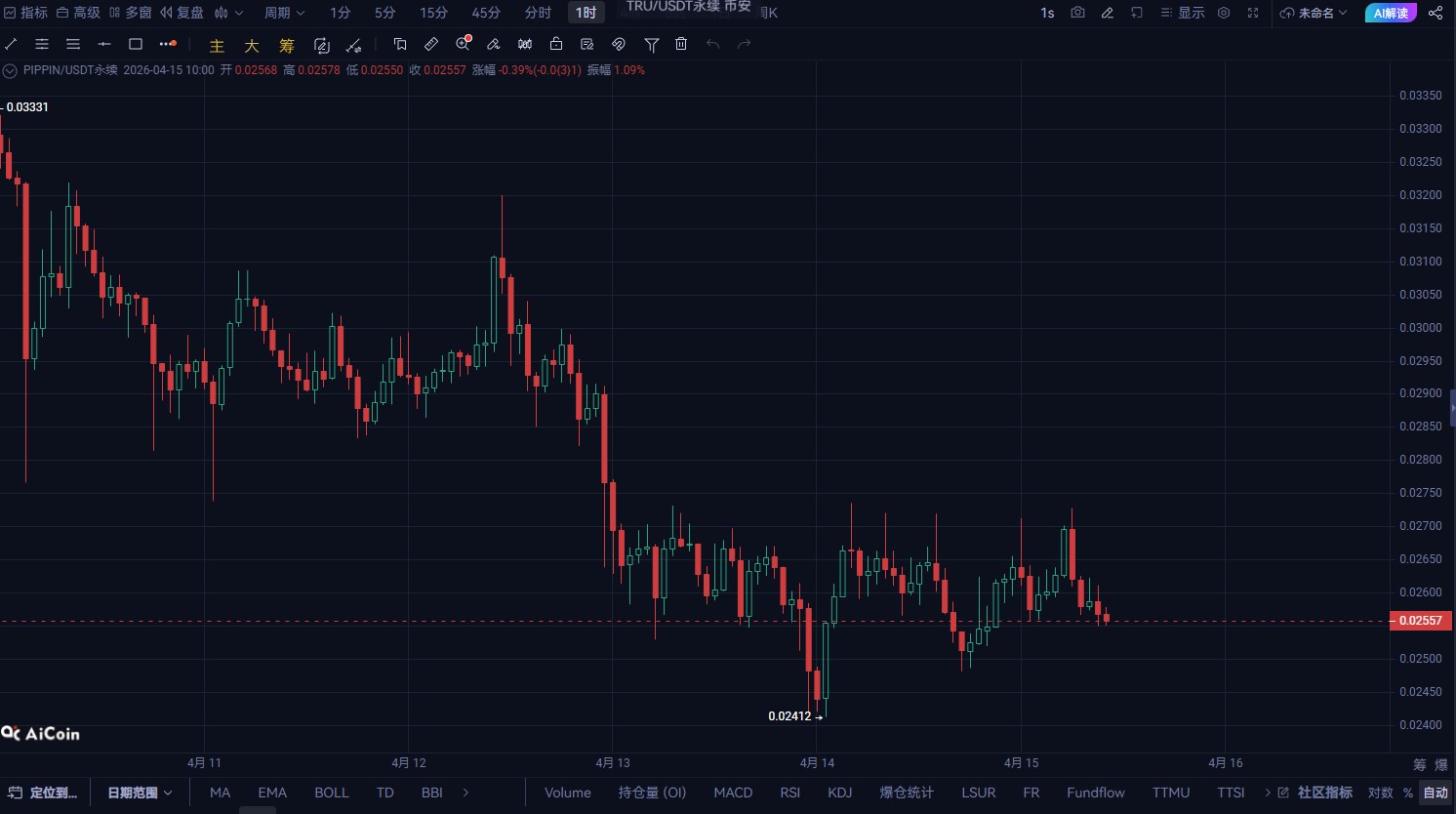 前期从0.029附近直接砸到0.026 随后最低触及0.0241 当前围绕0.0255震荡