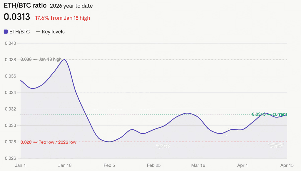 根据市场公开数据,ETH/BTC 比率于 2026 年 1 月 18 日曾短暂触及 0.038 附近的阶段性高点,随后在 2 月回落至 0.028 区间,创下 2026 年迄今最低水平。进入 4 月,该比率逐步回升至 0.0313 左右。