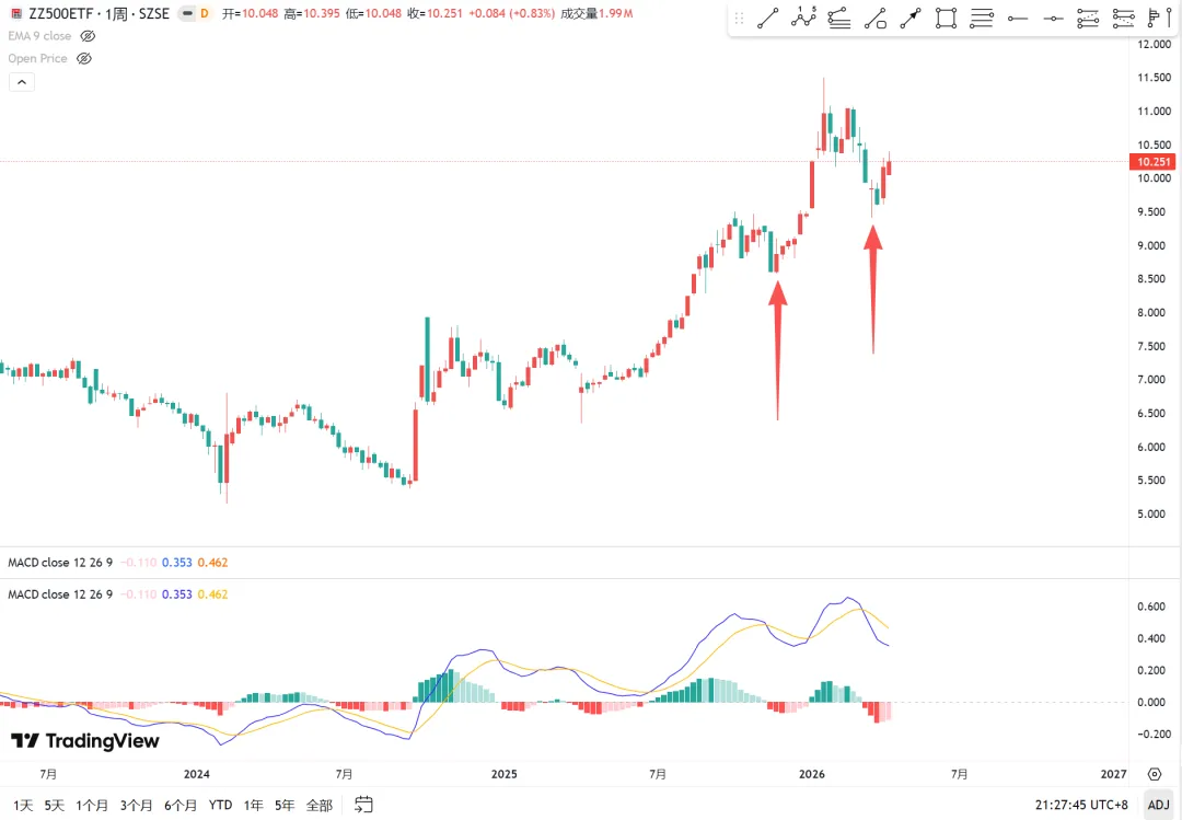 中証500の週足チャート、最近2回とも正しかった。