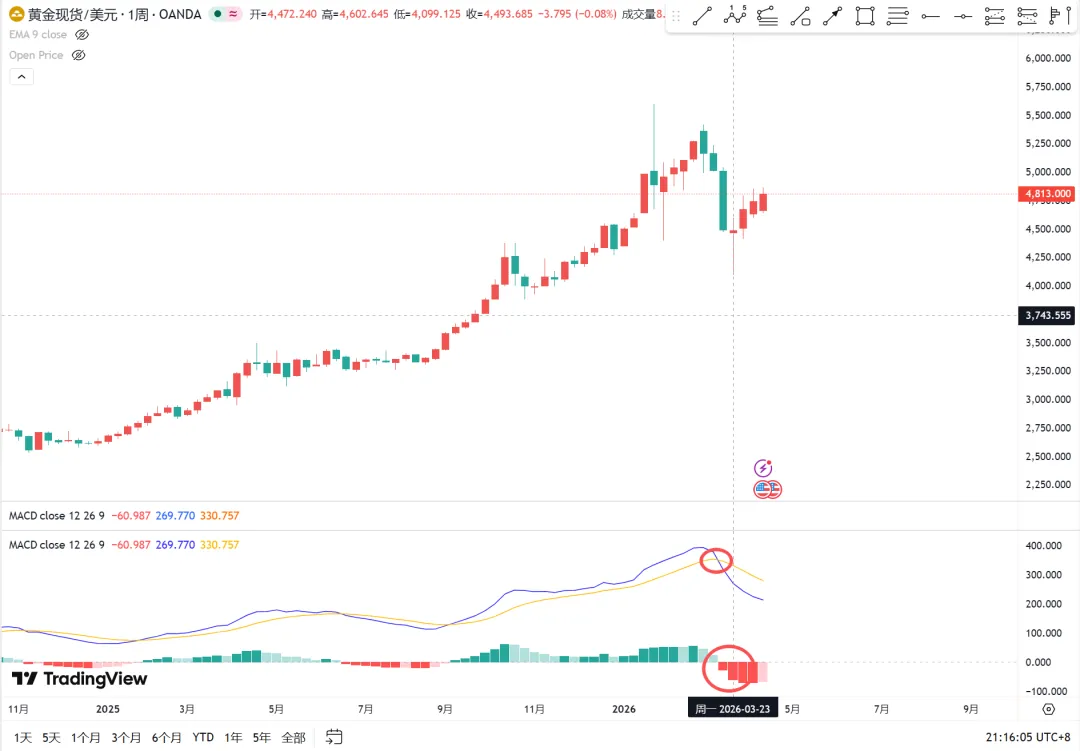 兄弟たち、今日はとても面白い動きに気づいたよ。 それはMACDの週足でのゴールデンクロスとデッドクロスが、日足のピークと底を判断するのに役立つということだ。どうやって使うか、例を挙げると: 1:0軸下でMACDがゴールデンクロス、上昇する?違う。2:エネルギー棒の2番目の棒3:日足ではピーク。この方法は反発終了のシグナルを判断できる。 その有効性はどうか?すでにあるのは: 現在、ビットコインが反発していて、0軸下でMACDがゴールデンクロス、今週はエネルギー棒の最初の棒だ。 もし上記の判断方法が正しければ、来週ビットコインは下落する。この方法には2つの用途がある。 1:反発終了のシグナルで、これ以上ロングを続けるのはやめた方がいいと教えてくれる。 2:空売りのチャンスを待つことを考え始める。週足のシグナルなので、操作は主に日足で行う。 だから、日足のブレイクアウトはできない。 一時的なフェイクブレイクやネックライン割れを待つのが良い。 とにかく、反転に備えて常に準備しておくこと。逆に、0軸上でのMACDデッドクロスは底を示す。 黄金の週足チャート。1:0軸上でMACDデッドクロス2:出来高棒の2番目の棒3:日足で底。この方法を知っていれば、少なくとも紙の金は損切りすべきではなかった。 むしろ、買いのチャンスだった。この方法は100%正しいのか?直感的にはそうではない。 少なくともレンジ相場では成功率が低いかもしれない。 なぜなら、MACD自体はレンジ指標ではないからだ。 レンジ相場では使えない。 底を判断するには、連続大幅下落の恐怖を伴う反発を利用した方が良い。 または、トレンドの継続中にいつ調整が終わるかを判断するために使う。 反転にはあまり使えないだろう。この方法を使ってA株を仕掛けてみる。 中証500の週足チャート、最近2回とも正しかった。 0軸上でMACDがデッドクロス、2番目の棒、日足では底をついている。周期の注意点は、週足のMACDを使って日足のピークと底を判断することだ。 日足や4時間足でも使えるか? それは自分たちで研究してみてほしい。