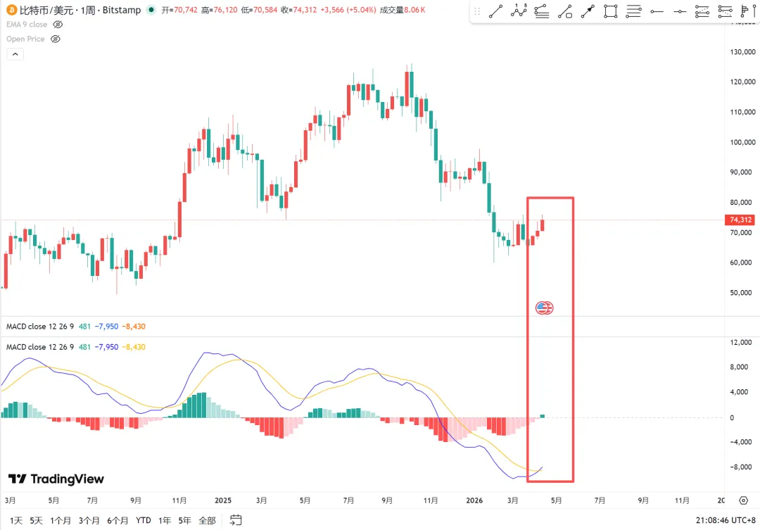 現在、ビットコインが反発していて、0軸下でMACDがゴールデンクロス、今週はエネルギー棒の最初の棒だ。