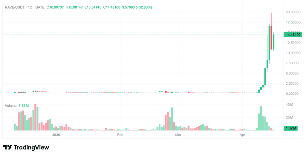 2026年4月16日時点で、Gateの行情データによると、RaveDAOのネイティブトークンRAVEの現在価格は14.75ドル、24時間の取引高は55.89百万ドル、流通時価総額は約32.6億ドル、全流通時価総額は約141.9億ドルです。このトークンは過去24時間で約11.75%下落しましたが、時間軸を長く見ると、4月上旬以降、RAVEは約0.25ドルの安値から一気に上昇し、歴史最高値は19.84ドルに達し、累計上昇率は50倍超となっています。過去7日間で約4,345%、30日間で約5,222%、1年で約8,676%の価格変動を見せています。価格の激しい変動に伴い、日平均数千万ドル規模の取引高と市場関心の継続的な高まりも見られます。RAVEは短期間であまり知られていなかったトークンから暗号市場の時価総額上位のプロジェクトへと躍進しましたが、この上昇の背後にある推進力は、単一のファンダメンタルなストーリーだけでは説明できません。