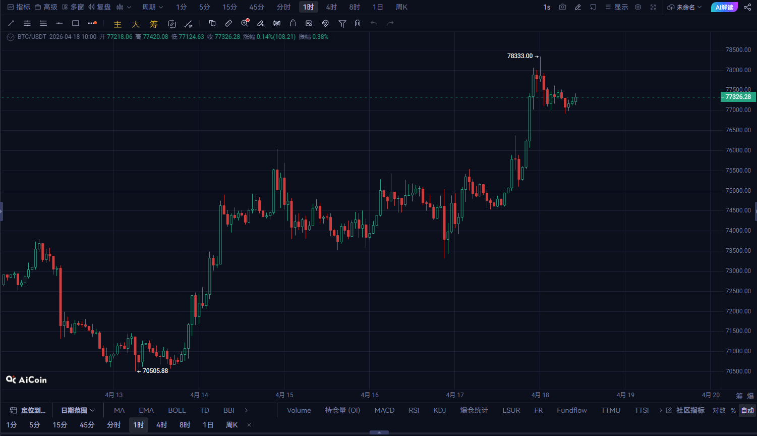 現在価格:77326.28ローソク足チャートから見ると、BTCは75000を突破した後、短期的なレンジ相場に入り、現在の価格は77000付近で安定している。市場は強い上昇局面を経て、明らかに高値圏での調整段階に入っている。次の焦点は、価格が現在の抵抗域をスムーズに突破できるかどうか、引き続き上昇を続けるか、もしくは調整局に入るかにかかっている。以下、日足、4時間足、1時間足の3つの周期からBTCの動向を分析する。一、日足レベル:強気の買い圧力は未だ破られず、短期抵抗域が徐々に近づく日足の構造は依然として強気の買い圧力を維持:安値7055.88が強いサポートを確認その後、価格は急上昇し、複数の抵抗線を突破現在は77000付近で、これは前期高値付近の抵抗域現在の上昇は依然として強気のトレンドの中にあり、明確な天井シグナルは出ていない。ただし、注意すべきは、現在前期の抵抗域に近づいている点で、もし価格が77000を超えられなければ、一定の調整圧力に直面する可能性がある。日足結論:トレンド:買い圧力未破、強気の上昇状態:レンジ整理、抵抗域突破後は上昇継続の可能性重要な位置:サポート:75000 / 74000抵抗:78000 / 79000二、4時間足レベル:短期的なレンジ調整、突破待ち4時間足チャートは、BTCが77000を突破した後、レンジ調整状態に入ったことを示している:価格は既に何度も77000に触れたが、効果的に突破できていないサポートラインは大体76500付近で、価格はやや下落一時的に横ばいの調整形態を形成し、市場には方向性の勢いが見られないこれが示すのは:👉 現在、BTCは短期的な抵抗に直面しているが、下のサポートは比較的堅固。👉 調整段階は突破前の準備期間であり、突破成功すれば目標は78000やそれ以上の高値域を目指す。4時間足結論:トレンド:レンジ調整状態:短期的には依然として買い優勢、突破待ち重要な位置:サポート:76500 / 76000抵抗:78000 / 79000三、1時間足レベル:短期的なレンジ、価格は重要域にある1時間足の詳細は:価格は76500-77000の範囲内でレンジを形成し、短期的に突破できていない上昇の勢いは徐々に弱まり、区間内で反復的に試している現在の短期的な変動は重要な範囲内にあり、突破すれば上昇継続、そうでなければ調整に入る可能性が高いこれが示すのは:👉 現在のBTCの動きは短期的なレンジを示しており、市場のセンチメントは比較的安定している。短期的には価格が77000を突破できるかに注目。👉 突破すれば78000や79000に向かう可能性があり、調整の場合は76500付近のサポートを再確認する展開になる。1時間足結論:トレンド:レンジ、突破待ち状態:短期的なレンジ、突破または調整次第で今後の動きが決まる重要な位置:サポート:76500 / 76000抵抗:77000 / 78000四、総合判断(コア分析)BTCの全体構造は依然として強気だが、高値圏でのレンジ調整段階に入っている。もし77000を突破できれば、新たな上昇局面に入り、目標は78000や79000も視野に入る。突破できなければ、短期的には調整に入り、サポートラインは76500と76000となる。五、取引戦略(実戦的な戦略)1️⃣ ロング戦略(基本方針)短期のロングに適した操作:77000を突破したら追随し、目標は78000-7900076500-76000で押し目買いの機会を探るストップロス:76000割れで即損切り2️⃣ ショート戦略(慎重に)77000を突破できなければ、77000付近で空売りを試すストップロス:78000上方で損切りターゲット:76500 → 760003️⃣ リスク管理ポイント77000付近で頻繁に売買を繰り返さず、突破方向を確認してから行動ポジションをコントロールし、追い買いや売りを避ける六、リスク警告現在、市場はすでに高値圏でのレンジ状態にあり、突破失敗や調整リスクが大きいため、操作時はポジションとストップロスを厳重に管理する必要がある。突破失敗は大きな調整を引き起こす可能性がある。