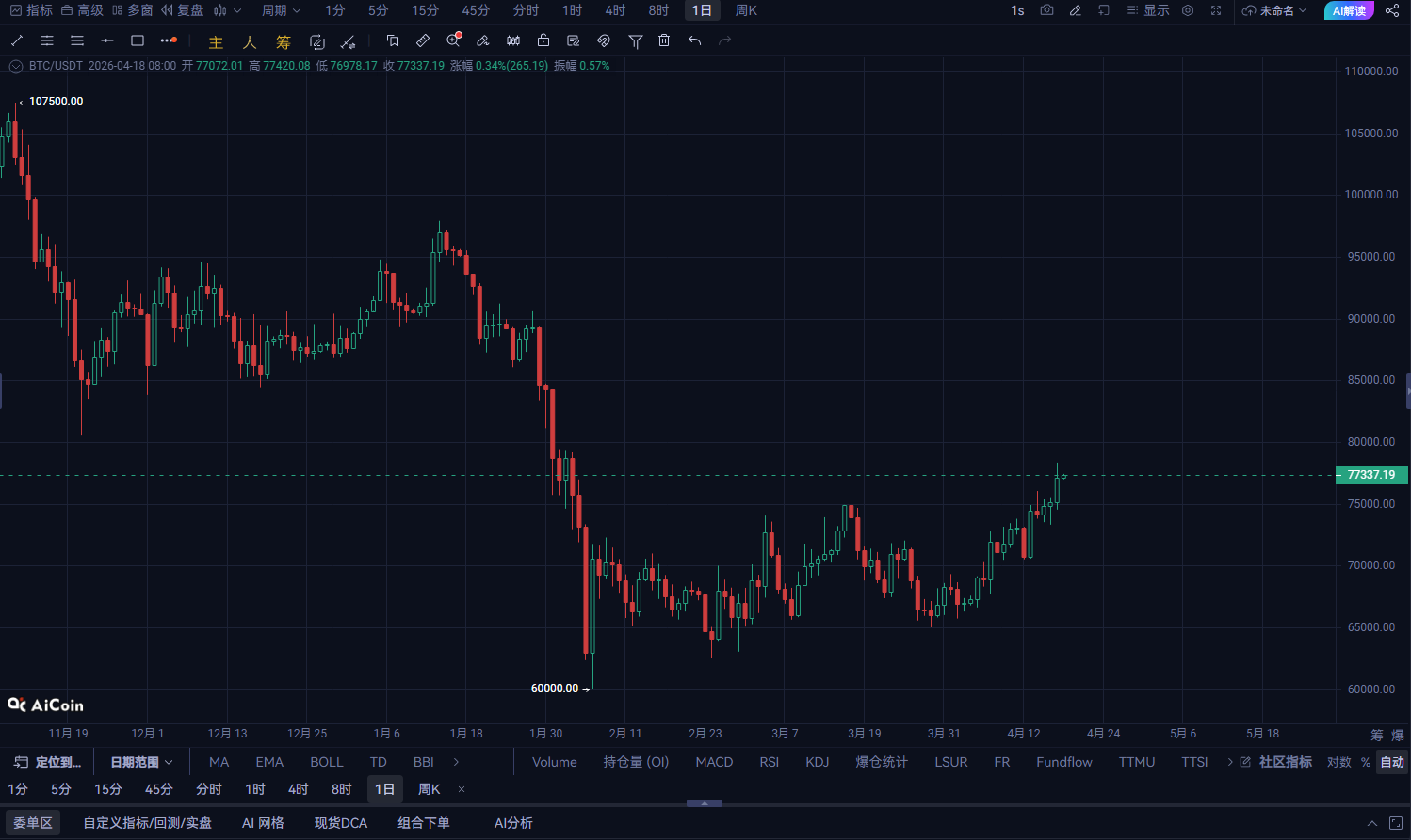 現在の上昇は依然として強気のトレンドの中にあり、明確な天井シグナルは出ていない。ただし、注意すべきは、現在前期の抵抗域に近づいている点で、もし価格が77000を超えられなければ、一定の調整圧力に直面する可能性がある。