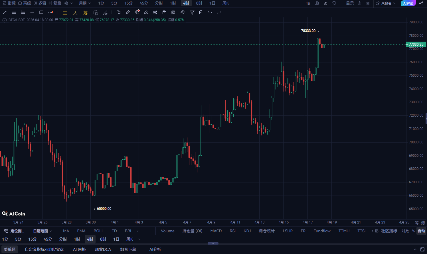 BTCは77,000を突破した後、短期的に調整と整理を経て、新高値突破はさらなる上昇を迎える可能性があります!