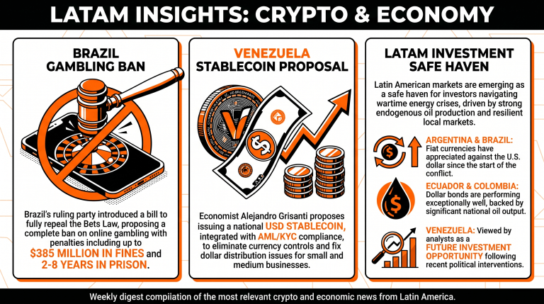 ラテンアメリカ・インサイトへようこそ。過去1週間のラテンアメリカにおける最も重要な暗号資産ニュースを集約したまとめです。今号では、ブラジルでオンライン賭博を全面的に廃止する法案が提出され、ベネズエラでは通貨制限を抑えるためにステーブルコインを盛り込む提案が浮上し、戦争の余韻の中で投資機会としてのラテンアメリカが高まっています。