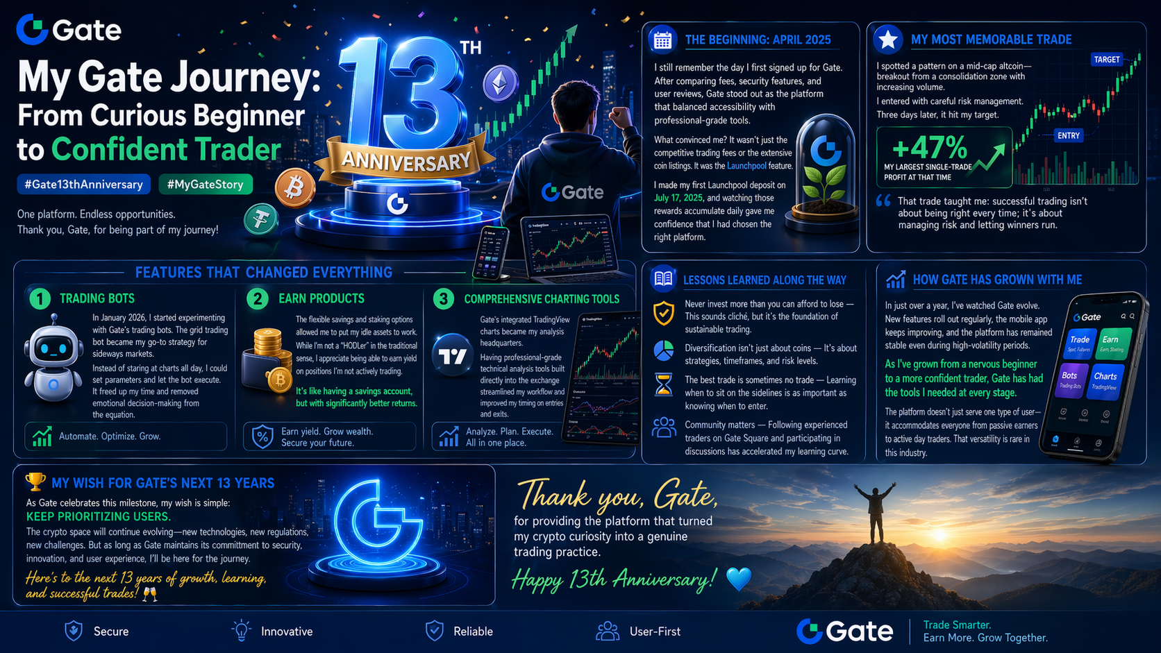 **[#Gate13thAnniversary]() [#MyGateStory]()**---## 始まり:2025年4月私はまだ、最初にGateに登録した日を覚えています。2025年4月で、数週間にわたり暗号通貨取引所を調査していました。手数料、安全性、ユーザーレビューを比較した結果、Gateはアクセスしやすさとプロフェッショナルなツールのバランスが取れているプラットフォームとして際立っていました。何が私を納得させたのか?それは競争力のある取引手数料や豊富なコインリストだけではありませんでした。**Launchpool機能**です。暗号通貨初心者の私にとって、資産を保有しながら受動的な収入を得るというアイデアは革新的でした。2025年7月17日に初めてLaunchpoolに預け入れを行い、その報酬が毎日積み重なるのを見て、正しいプラットフォームを選んだと自信を持てました。---## 私の最も記憶に残る取引すべてのトレーダーには、その旅路を定義する一つの取引があります。私にとってそれは、2025年後半の変動の激しい市場状況の中でのことでした。数ヶ月間テクニカル分析を学び、ミッドキャップのアルトコインにパターンが形成されているのを見つけました。その設定は完璧でした—収束ゾーンからのブレイクアウトと増加する出来高。私は慎重なリスク管理を行いながらポジションに入りました。これはGateの教育リソースから学んだことです。その取引が3日後に目標に到達したとき、私は47%の利益を得ていました—その時点での最大の単一取引の利益です。しかし何よりも重要なのは、忍耐と規律が報われることを自分自身に証明したことです。その取引は私にとって重要な教訓を教えてくれました:**成功する取引は、常に正解を出すことではなく、リスクを管理し、勝者を伸ばすことにある。**---## すべてを変えた機能Gateの3つの機能が、私の暗号通貨へのアプローチを根本的に変えました。### 1. **トレーディングボット**2026年1月、私はGateのトレーディングボットを試し始めました。グリッドトレーディングボットは、横ばい市場での私のお気に入り戦略になりました。チャートを一日中見つめる代わりに、パラメータを設定してボットに実行させることができました。これにより時間を節約でき、感情に左右される意思決定を排除できました。### 2. **Earn製品**柔軟な貯蓄やステーキングのオプションにより、放置している資産を有効活用できました。私は伝統的な意味での「HODLer」ではありませんが、取引していないポジションで利回りを得られることに感謝しています。まるで普通の貯金口座のようですが、はるかに良いリターンがあります。### 3. **包括的なチャートツール**Gateの統合されたTradingViewチャートは、私の分析の拠点となりました。プロフェッショナルなテクニカル分析ツールが取引所に直接組み込まれていることで、作業の流れがスムーズになり、エントリーとエグジットのタイミングが向上しました。---## これまでに学んだ教訓過去1年で、私はいくつかの厳しいが価値のある教訓を学びました。* **失っても良い金額以上は投資しない** — これは陳腐に聞こえるかもしれませんが、持続可能な取引の基礎です。* **分散投資はコインだけではない** — それは戦略、時間軸、リスクレベルに関するものです。* **最良の取引は時には取引しないこと** — いつエントリーすべきかを知ることと同じくらい、傍観するタイミングも重要です。* **コミュニティは重要** — Gate Squareで経験豊富なトレーダーをフォローし、議論に参加することで、学習曲線が加速しました。---## Gateとともに成長した私わずか1年余りで、Gateの進化を見てきました。新機能は定期的に追加され、モバイルアプリも改善を続けており、市場の高い変動性の中でもプラットフォームは安定しています。初心者から自信を持つトレーダーへと成長する中で、Gateは必要なツールをすべて提供してくれました。このプラットフォームは、一つのタイプのユーザーだけに対応しているわけではありません—受動的に稼ぐ人からアクティブなデイトレーダーまで、誰もが使える多様性を持っています。その多様性は、この業界では稀です。---## Gateの今後13年間への願いGateがこの節目を迎えるにあたり、私の願いはシンプルです:**ユーザーを優先し続けてください。** 暗号通貨の世界は進化し続けます—新しい技術、新しい規制、新たな課題。しかし、Gateがセキュリティ、イノベーション、ユーザー体験へのコミットメントを維持する限り、私はこの旅に付き添います。これからの13年間の成長、学び、そして成功した取引に乾杯! 🥂---*Gate、私の暗号通貨への好奇心を本格的な取引に変えてくれたプラットフォームを提供してくれてありがとう。13周年おめでとう!*
