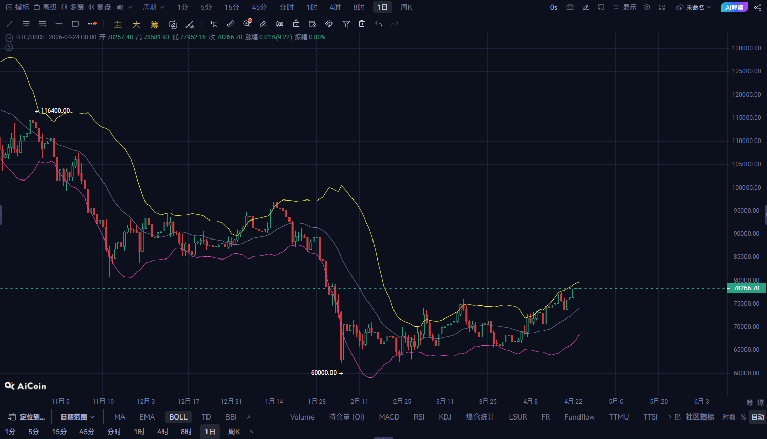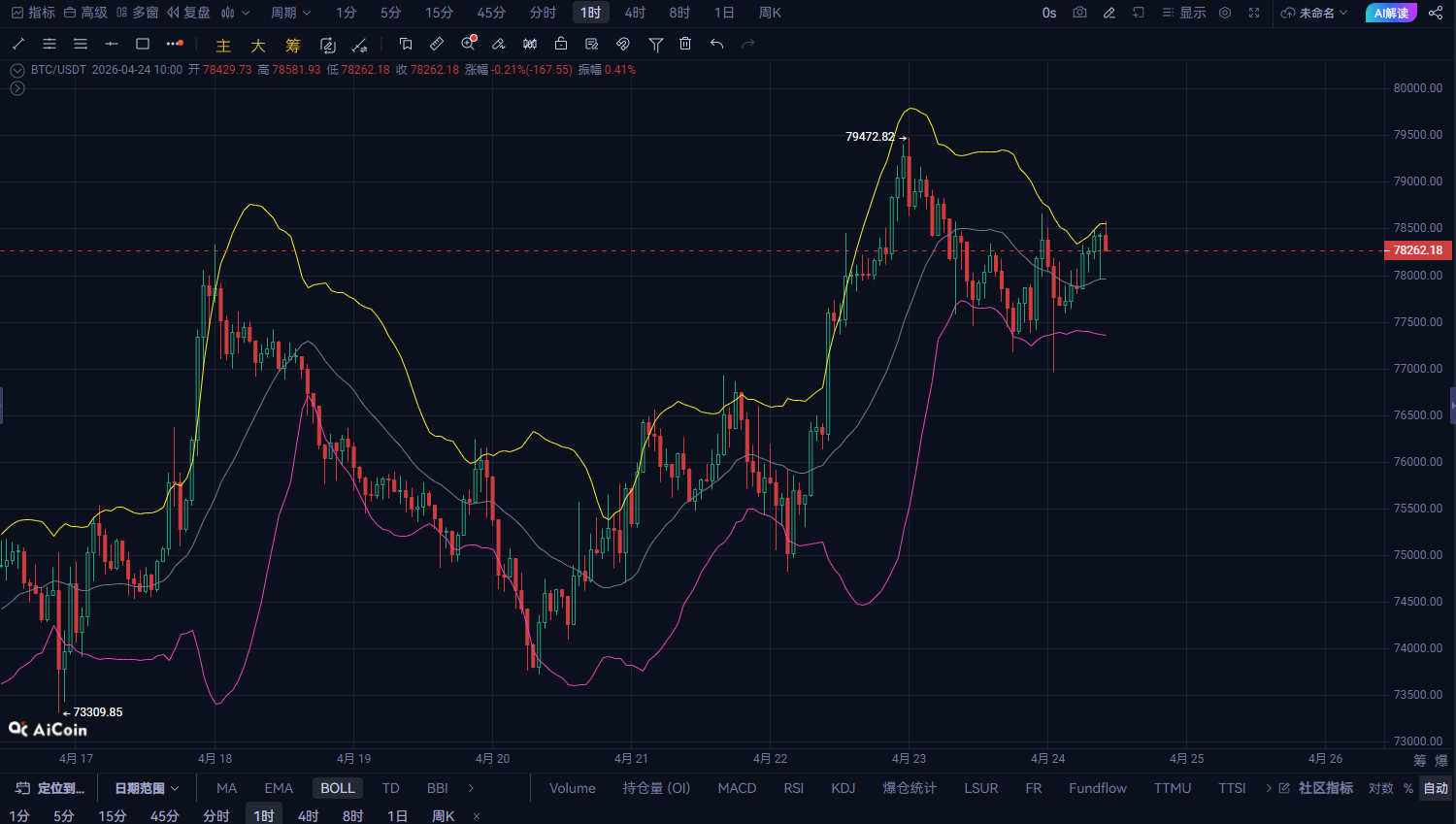 現在価格:78262.18直接結論:BTC短期構造は弱含み始めており、高値での震蕩後のやや弱気な局面に入っている。日内は「震蕩下落」の方が優勢で、引き続き強気の突破よりも下落傾向に傾いている。一、4時間足:上昇エネルギーの衰退、分岐領域に入る78000上方へ上昇したが、持続的な出来高増加はなし高値のローソク足実体が縮小し、停滞の兆候MACDは高値で鈍化し、死叉の予兆ボリンジャーバンドの上バンドは平坦化し、価格は中軌道付近へ下落開始核心判断:4時間足は上昇後のエネルギー衰退段階にあり、いつでも押し目修正の可能性二、1時間足:短期構造は弱気に転換、リズムが変化明確な「上昇→下落→反発力不足」構造が出現何度も78500付近で反発圧力に抑えられる移動平均線が反転し、価格は移動平均線の下へ下落MACDは弱気ゾーンに入り、出来高を伴って拡大短期リズム:弱気が次第に主導権を握りつつある三、日内の動きの予測78500をしっかりと維持できない場合:日内はおおむね震蕩しながら下落へ向かう可能性が高いまずは78000割れ後の下押しを見守る下方のサポートは77000付近を注視四、直接取引戦略(指示通りに提示)方向:ショート(成行でエントリー)エントリー価格:78260付近利確:第一目標:77480(+1%)第二目標:76700(+2%)損切り:損切りライン:79430(約-1.5%)
