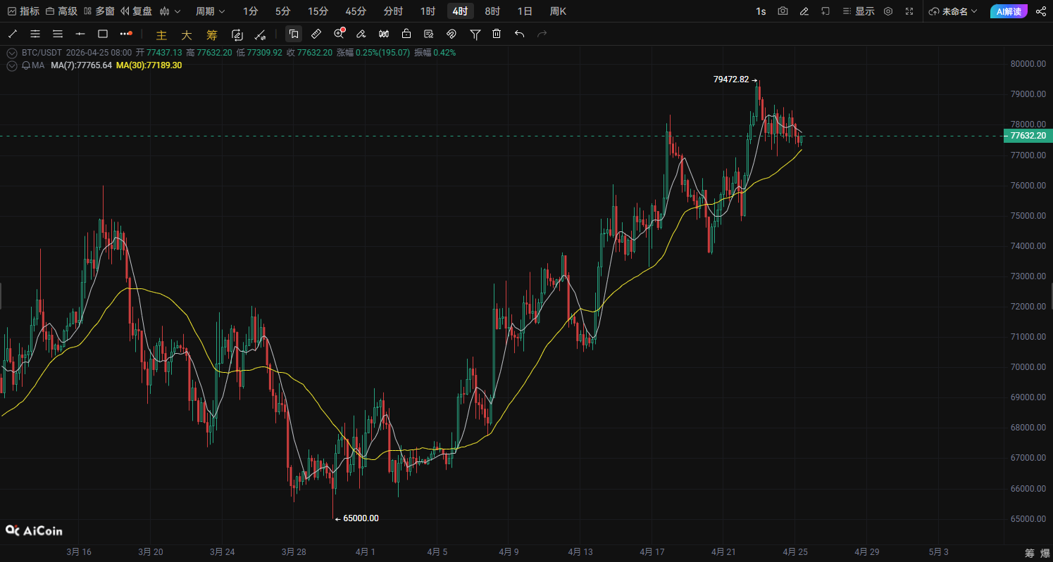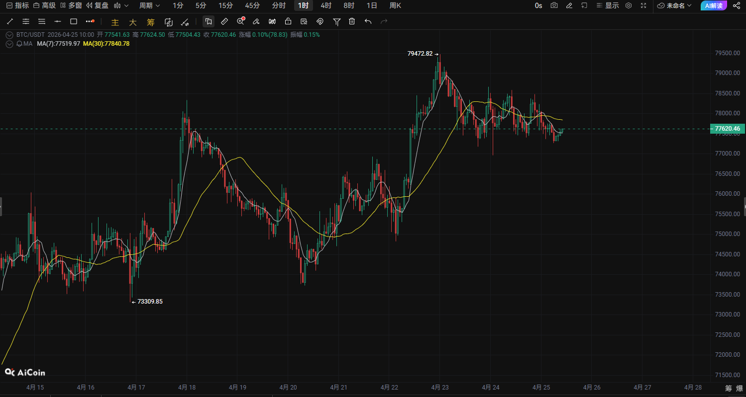 現在の時間 4月25日BTC価格:77540最近ビットコインは60000の安値から反発し、78000付近まで上昇、市場構造は空売りからレンジ相場へと変化している。機関投資資金とETFの継続的流入により、BTCは高値圏でのレンジを維持している。同時にテクニカル面は次のように示している:77500付近が短期的な重要サポートとなる上方の78000-80000は短期的な圧力エリア79000を突破すれば、相場はさらに上昇しやすい現在の動きは、平均線へのリトライ後の二次上昇構造であり、短期的には順張りの買いが適している。📊 BTC本日の動き構造分析1️⃣ 1時間足(短期トレンド)あなたのチャートから見て:MA7はMA30の上に位置しているローソク足は連続して安値を切り上げている小型の上昇チャネルを形成短期資金は継続的に買いを入れていることを示す。重要な構造:サポート:77000-77200ブレイクポイント:78000強い抵抗:7900077000を割らなければ、強気の構造は成立する。2️⃣ 4時間足(メイントレンド)4時間足で重要なシグナルが3つ現れている:1️⃣ 60000がフェーズの底値を形成2️⃣ Higher Low(より高い安値)が出現3️⃣ 価格が中期平均線を再び上回ったこれは、市場が反発局面の第二段階に入ったことを意味する。77500をしっかりと維持できれば、次の挑戦は:7900080000の心理的抵抗線🎯 BTC本日の買いエントリーストラテジー(成行注文)方向:買いエントリー方法:👉 成行買い:77540付近利確目標第一利確:78315(+1%)第二利確:79090(+2%)リスク管理損切り:76370(-1.5%)