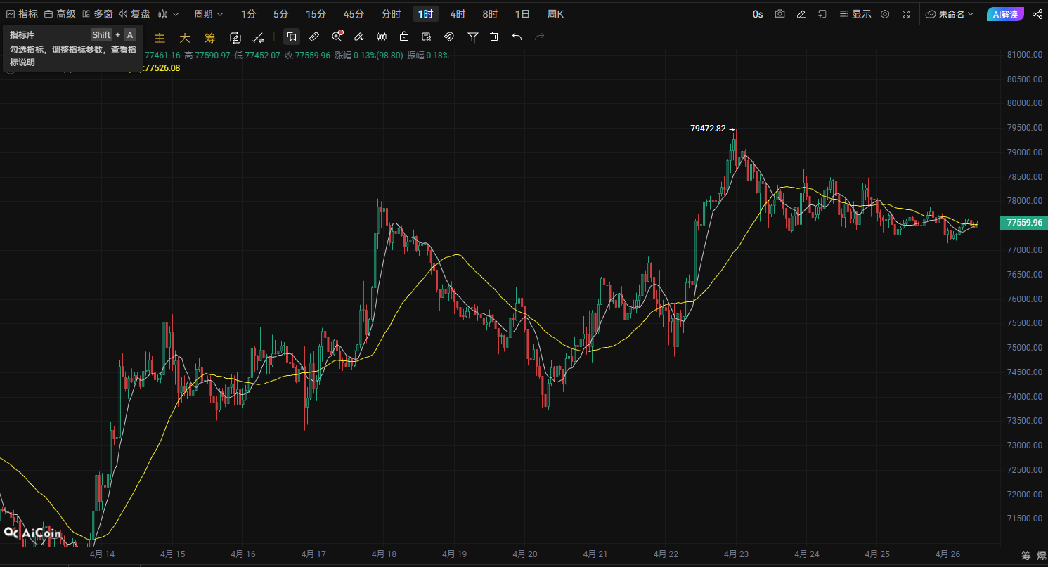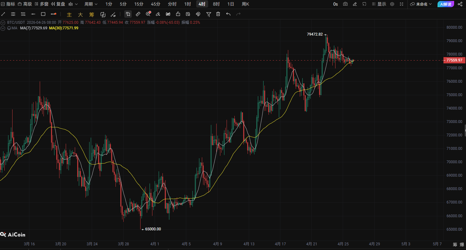 現在の時間:4月26日現在の価格:77584対象資産:Bitcoinあなたの示した動きから見ると、BTCは79472の高値をつけた後、上昇を続けずに、連続して震荡しながら下落し、高値も徐々に下がる構造になっています。現在の価格は77500付近で横ばいであり、この形態は上昇後の弱気な整理に近く、市場の短期的な買いエネルギーはやや弱まっています。今日の可能性としては、強気の突破よりも、震荡しながら弱気に推移し、下支えを再確認する動きになる可能性が高いです。📊 技術構造分析① 1時間足(短期構造)1時間足チャートを見ると:MA7がすでに価格を抑え始めている何度も反発しても78000をしっかり超えられない短期高値が徐々に下がっているこれは短期資金が徐々に利益確定を進めていることを示しています。重要なポイント:短期の抵抗線78000強い抵抗線78500短期の支持線77000二次的な支持線7650078000を突破できない限り、短期的に売り圧力が優勢になっていきます。② 4時間足(トレンドのリズム)4時間足は次のように示しています:1️⃣ 高値をつけた後、短期的なダブルトップの形状が見られる2️⃣ 上昇エネルギーが明らかに弱まっている3️⃣ K線が平均線の周りで震荡し始めているこの構造は、一般的に一度の技術的な押し目をつけて、再び支持線を探す動きが出やすいです。市場のセンチメントが弱まる場合、BTCは今日次の価格をテストする可能性があります:77000 → 76500🎯 BTC今日の空売り戦略(直接実行)取引方向:ショートエントリー方法👉 市場価格で空売り:77584付近利確目標第一利確76808(+1%)第二利確76032(+2%)リスク管理の損切り損切りライン78748(-1.5%)