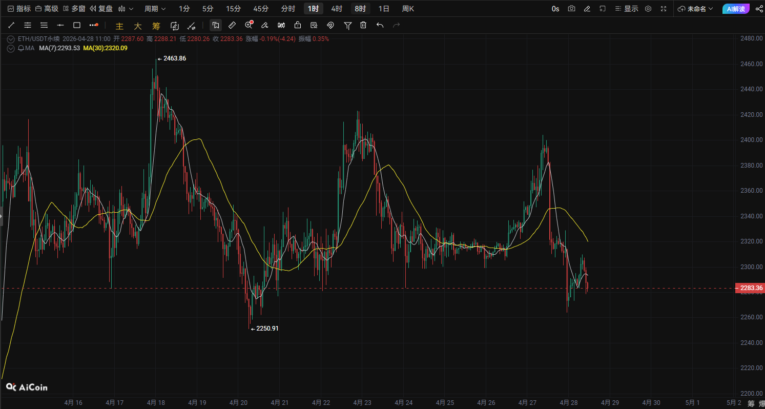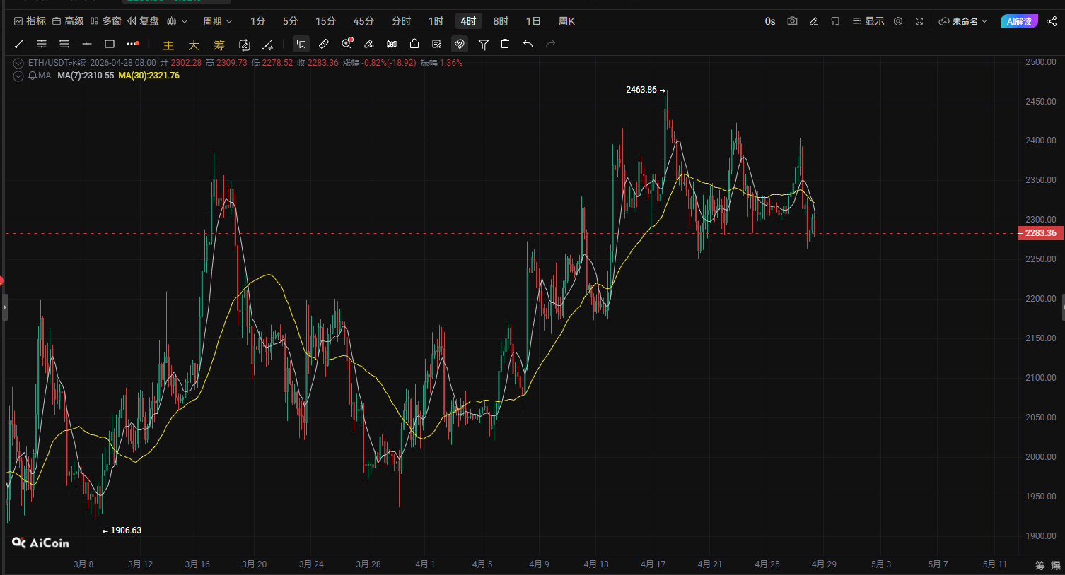 現在の時間:4月28日 現在の価格:2284 対象資産:Ethereum 全体の動きとして、ETHは1736の安値から反発した後、価格は徐々に安値を引き上げており、現在は再び2200上方のレンジに戻ってきている。最近の動きは、安値の引き上げと横ばいの整理の構造を示しており、これは通常、市場が蓄積と整理の段階に入っていることを意味する。 短期的には、市場の売り圧力は明らかに弱まっており、もし買い手が重要なサポートを維持し続ければ、本日は技術的な反発の可能性がある。 📊 技術構造分析 ① 1時間足(短期構造)  1時間チャートから見ると: MA7はすでに平行に上昇し始めている 価格は何度も2260付近で反発し、素早く持ち上げられている 短期的にレンジ上昇の構造を形成 これは、市場の短期資金が徐々に買いに回り始めていることを示している。 重要な位置: 短期サポート 2260 強力なサポート 2230 短期抵抗 2320 強力な抵抗 2350 2260が有効に割り込まれない限り、短期的な反発の構造は依然として成立している。 ② 4時間足(トレンド構造)  4時間足は次のように示している: 1️⃣ 価格は再び短期移動平均線の上に立った 2️⃣ 市場は安値の引き上げ構造を形成し始めている 3️⃣ 下落トレンドは緩やかになり始めている この構造は通常、市場が次の段階に入ることを意味している: レンジ底打ち → 徐々に反発 買い手が引き続き力を入れる場合、ETHは本日次の価格帯をテストする可能性がある: 2300 — 2330 🎯 ETH今日の買い戦略(直接実行) 取引方向:買い エントリー方法 👉 市場価格で買い:2284付近 利確目標 第一利確 2306(+1%) 第二利確 2329(+2%) リスク管理のストップロス ストップロス位置 2249(-1.5%)