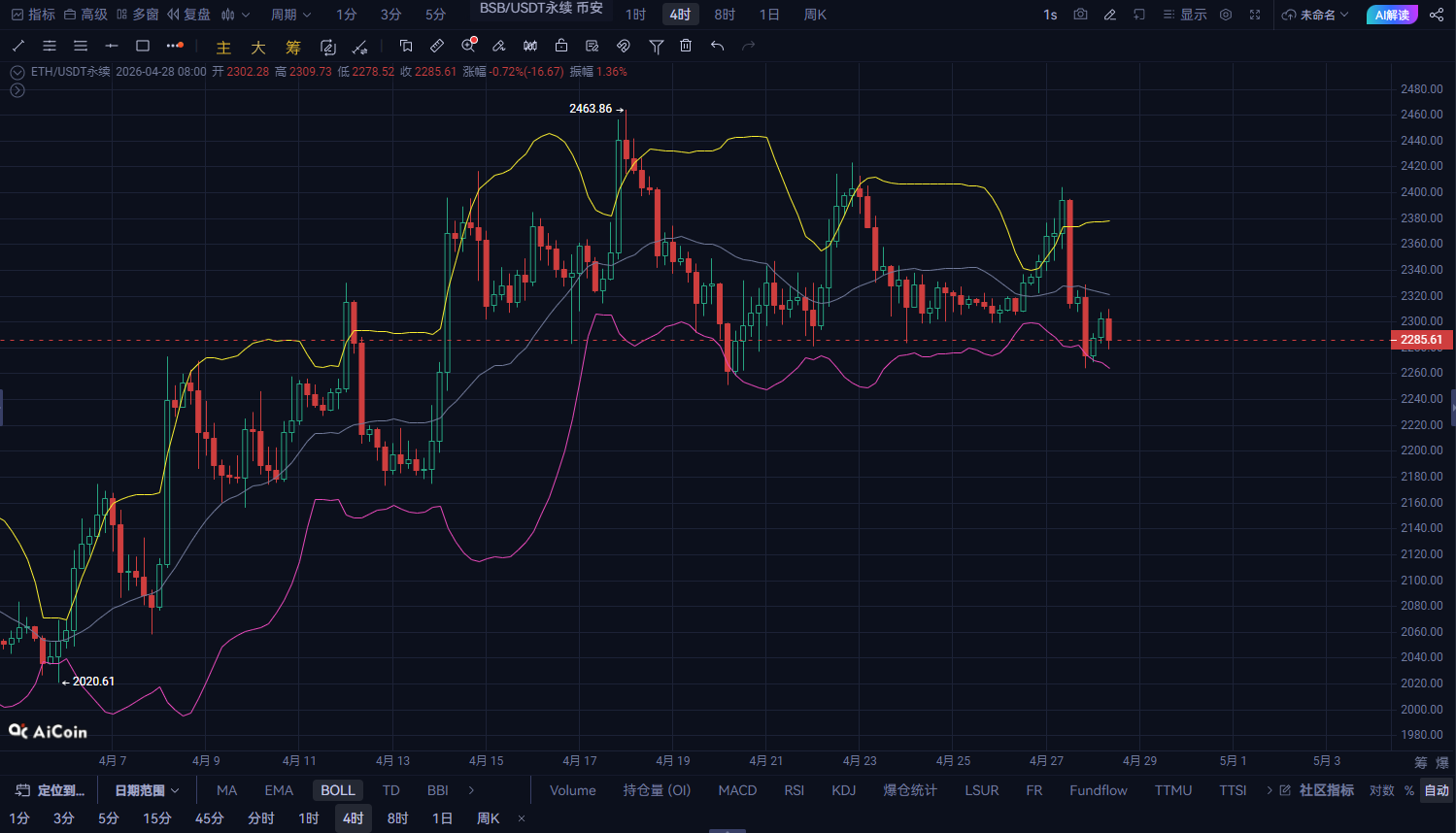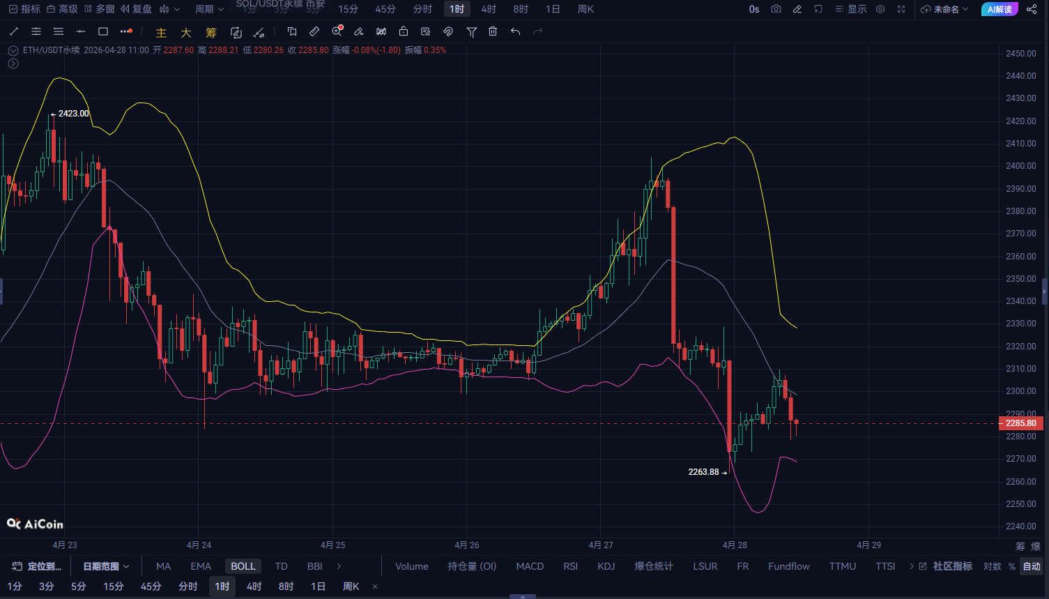 現在価格:2285.80まず結論:ETHは短期的に震荡構造から弱気運行に転じており、「反発失敗後の押し戻し段階」に属し、日内は更なる下落を伴う震荡を優先し、継続的な強さではない。一、4時間足:反発力不足、構造が弱まり始める2350付近への上昇失敗、上昇の持続なし高値が徐々に下がり、抑制構造を形成MACDの高値死叉の兆候が明らかボリンジャーバンドが収縮し始め、価格はミッドライン下に下落核心判断:4時間足は震荡偏弱の段階に入る二、1時間足:弱気のリズムが徐々に確立「高値更新→下落→反発力不足」の構造が出現複数回の反発は2300付近で抑えられる移動平均線は下向きに反転し、価格は移動平均線の下で推移MACDの弱気エネルギーが徐々に強まる短期リズム:弱い反発 + 段階的な下落三、日内の動きの予測2300-2320の範囲で再び安定できない場合:日内は更なる震荡下落を優先2260付近のサポートを最初にテスト割り込めば、2230付近まで伸びる可能性四、直接取引戦略(指示に従って提示)方向:空売り(成行注文)エントリー価格:2285.80付近利確:第一目標:2263(約-1%)第二目標:2240(約-2%)損切り:損切りライン:2320(約+1.5%)