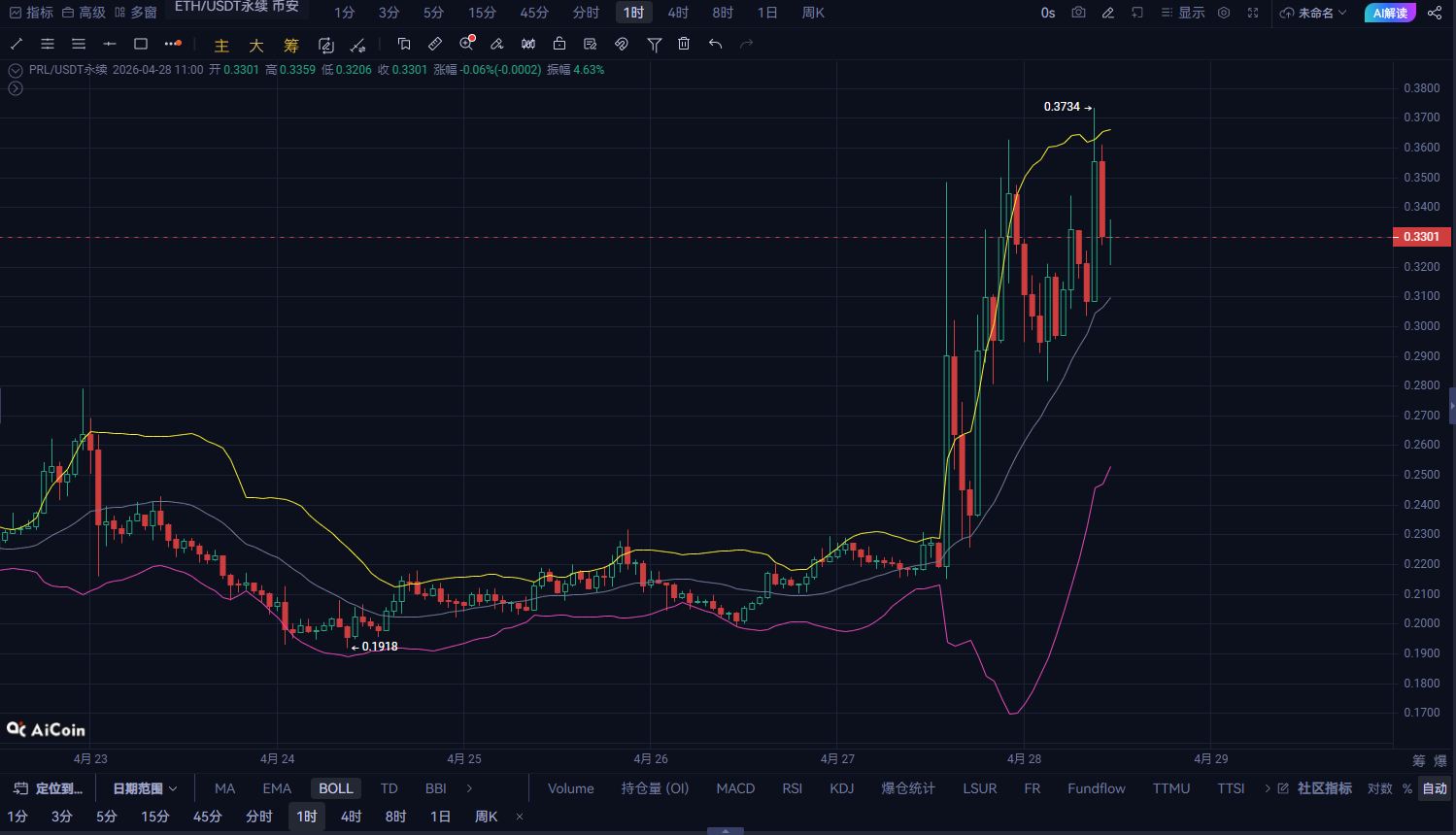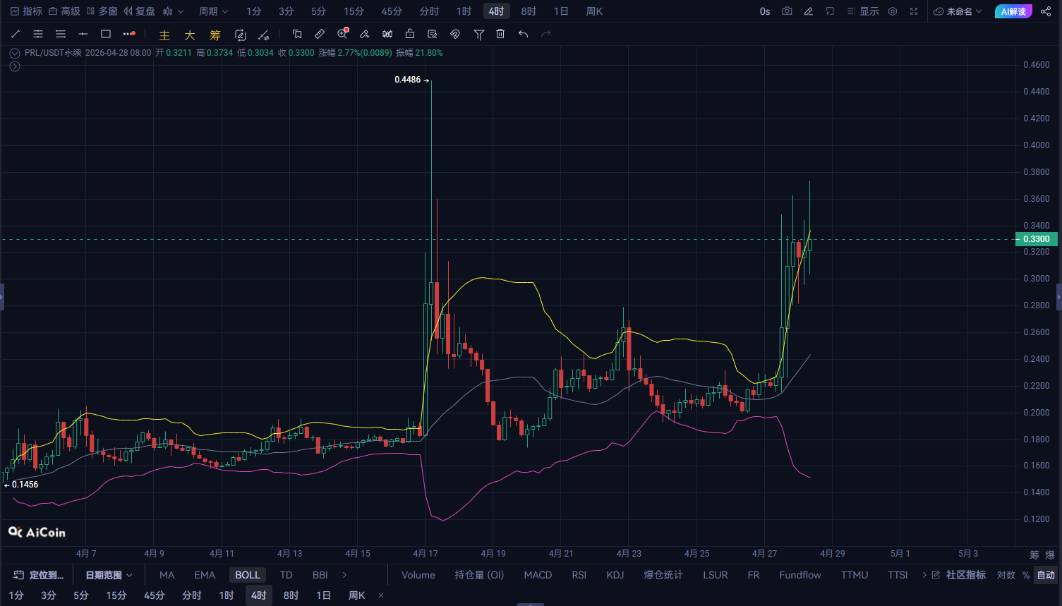 現在価格:0.3301まず結論:PRLは短期的に震荡構造から弱気運行に転じており、「高値突破失敗後の押し戻し段階」に属する。日内では上昇を追うよりも、震荡下行を優先する傾向が強い。一、4時間足:反発阻止、構造が弱まり始める0.34付近への上昇は定着せず高値が徐々に下がり、抑制を形成MACDは高値圏で反転し、死叉の兆候ボリンジャーバンドが収縮し、価格はミドルライン付近に戻る核心判断:4時間足は震荡の弱気側に入る二、1時間足:弱気のリズムが徐々に確立「高値→下落→反発力不足」の構造が出現複数回の反発は0.332-0.335の範囲で抑えられる移動平均線は下向きに反転し、価格は移動平均線の下で推移MACDの弱気エネルギーが徐々に強まる短期リズム:弱い反発 + 段階的な下落三、日内の動きの予測0.335を再び超えられない場合:日内は震荡下落の傾向まず0.327付近のサポートをテスト割り込めば、0.323付近まで伸びる可能性がある四、直接的な取引戦略(指示に従って提示)方向:空売り(成行注文)エントリー価格:0.3301付近利確:第一利確:0.3268(約-1%)第二利確:0.3235(約-2%)損切り:損切りライン:0.3351(約+1.5%)